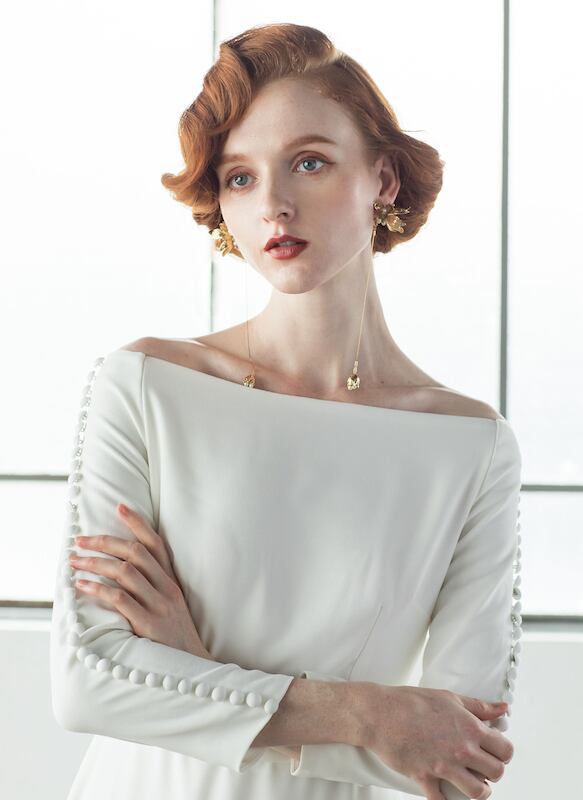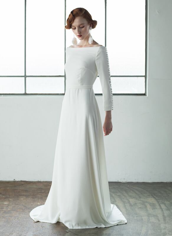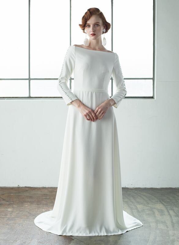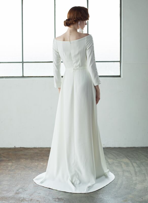 美品!オフショルダーになった長袖ドレス パーティードレス ボートネック 七分袖丈 動きやすいドレス ウエディングドレス ガーデンウェディング 2次会 | David1021k Dress(ダヴィドレス)