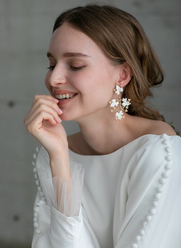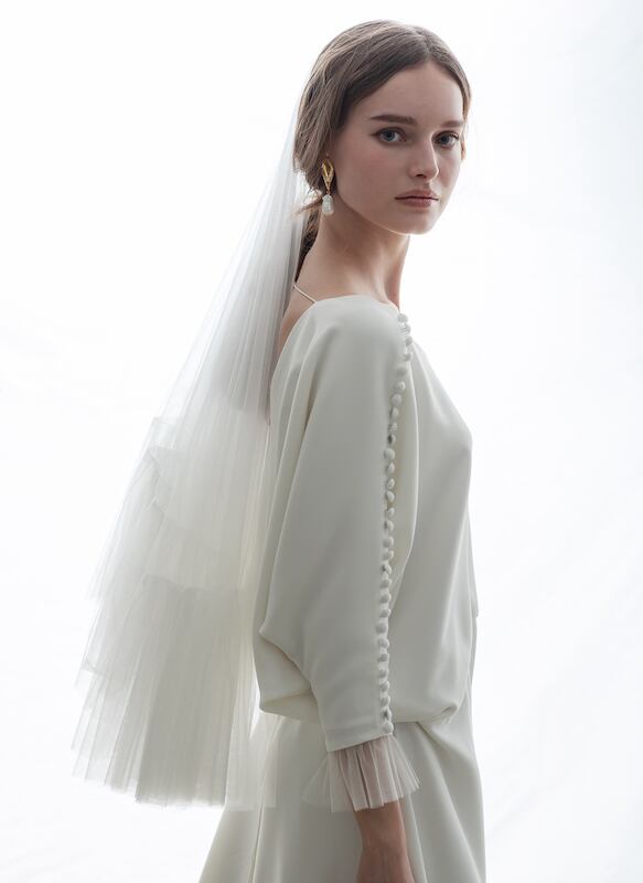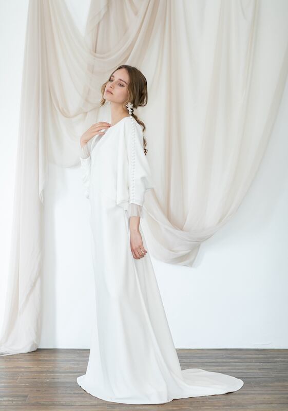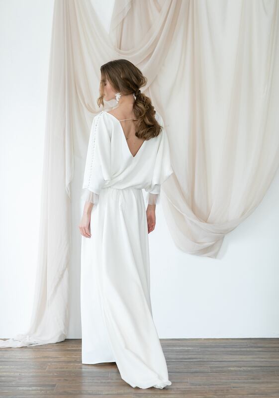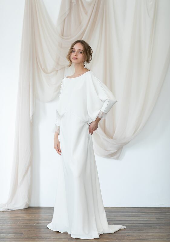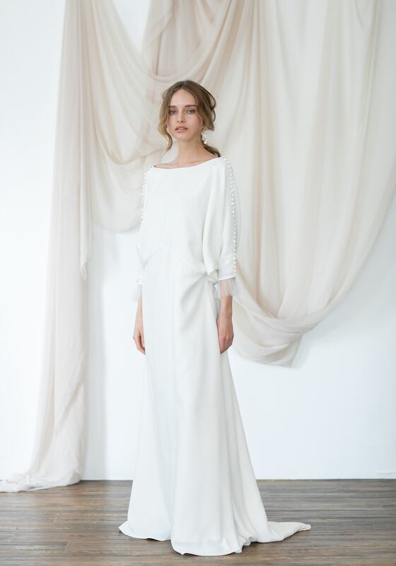 上品!ラウンドネック ブラウジング パーティードレス 程よいルーズ加減 七分袖丈 動きやすいドレス ウエディングドレス ガーデンウェディング 2次会 | David1021k Dress(ダヴィドレス)
