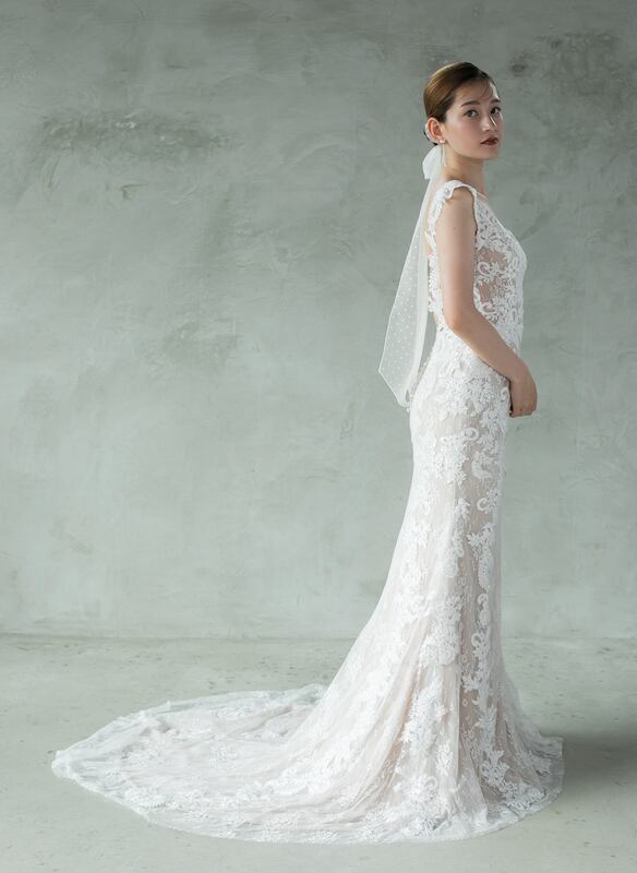 美品!ソフトマーメイドシルエット ピンクベージュ 総レースドレス ノースリーブ スレンダーライン ウエディングドレス 高みせ カラードレス パーティードレス