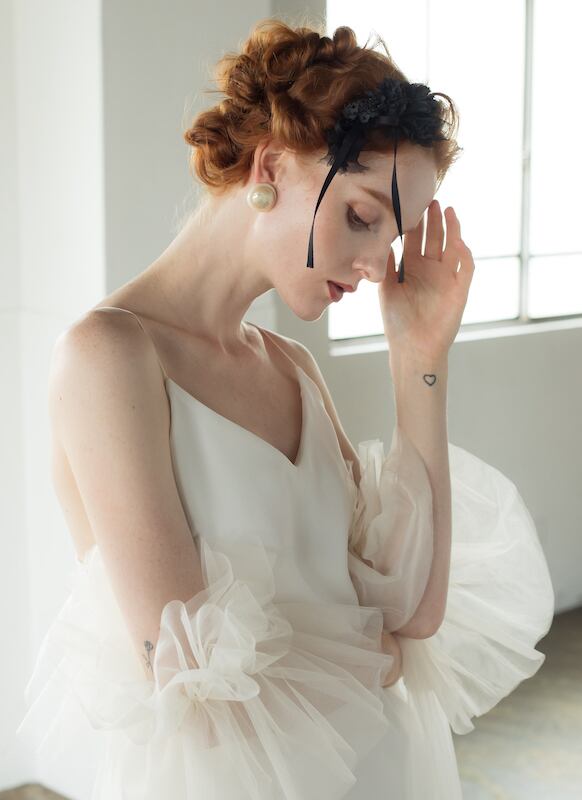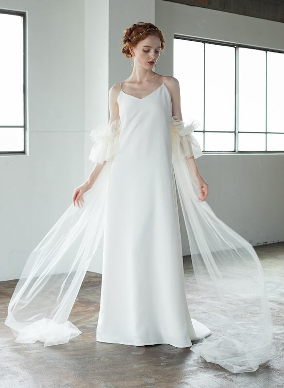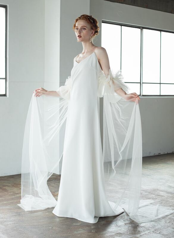 上品!軽やかなチュール袖 vネック シンプルなキャミソールドレス パーティードレス 動きやすいドレス ウエディングドレス ガーデンウェディング 色変更可能 | David1021k Dress(ダヴィドレス)