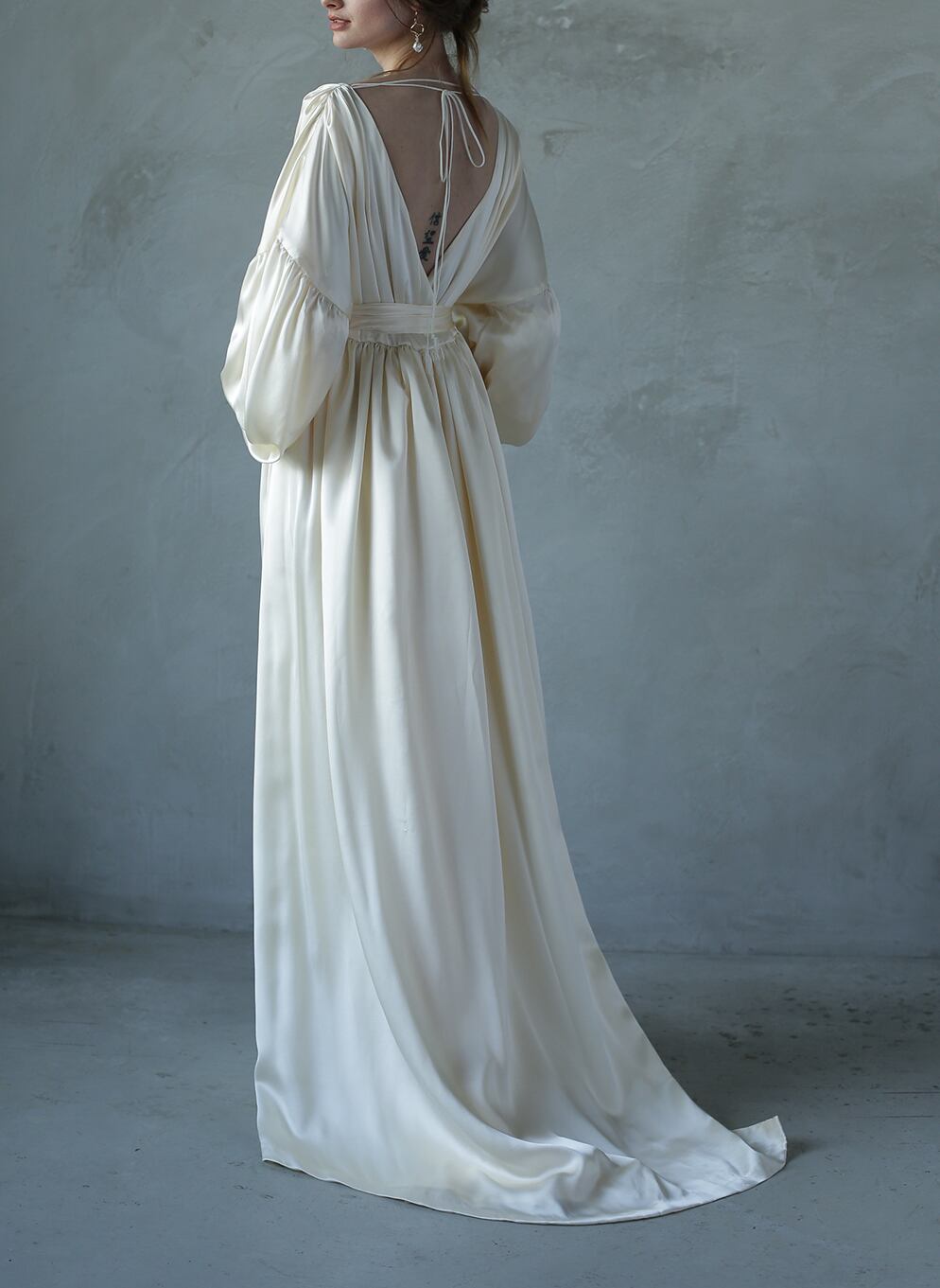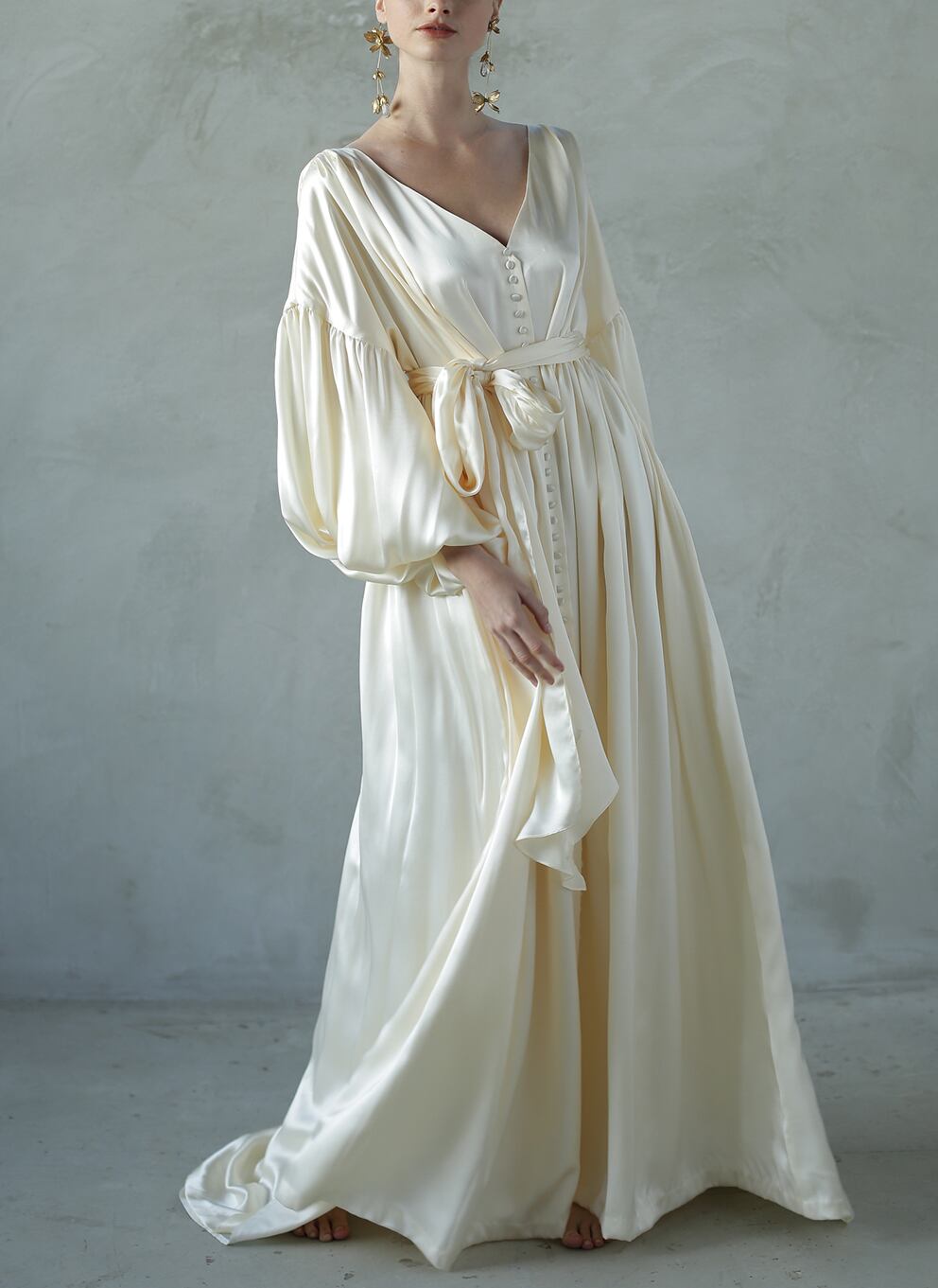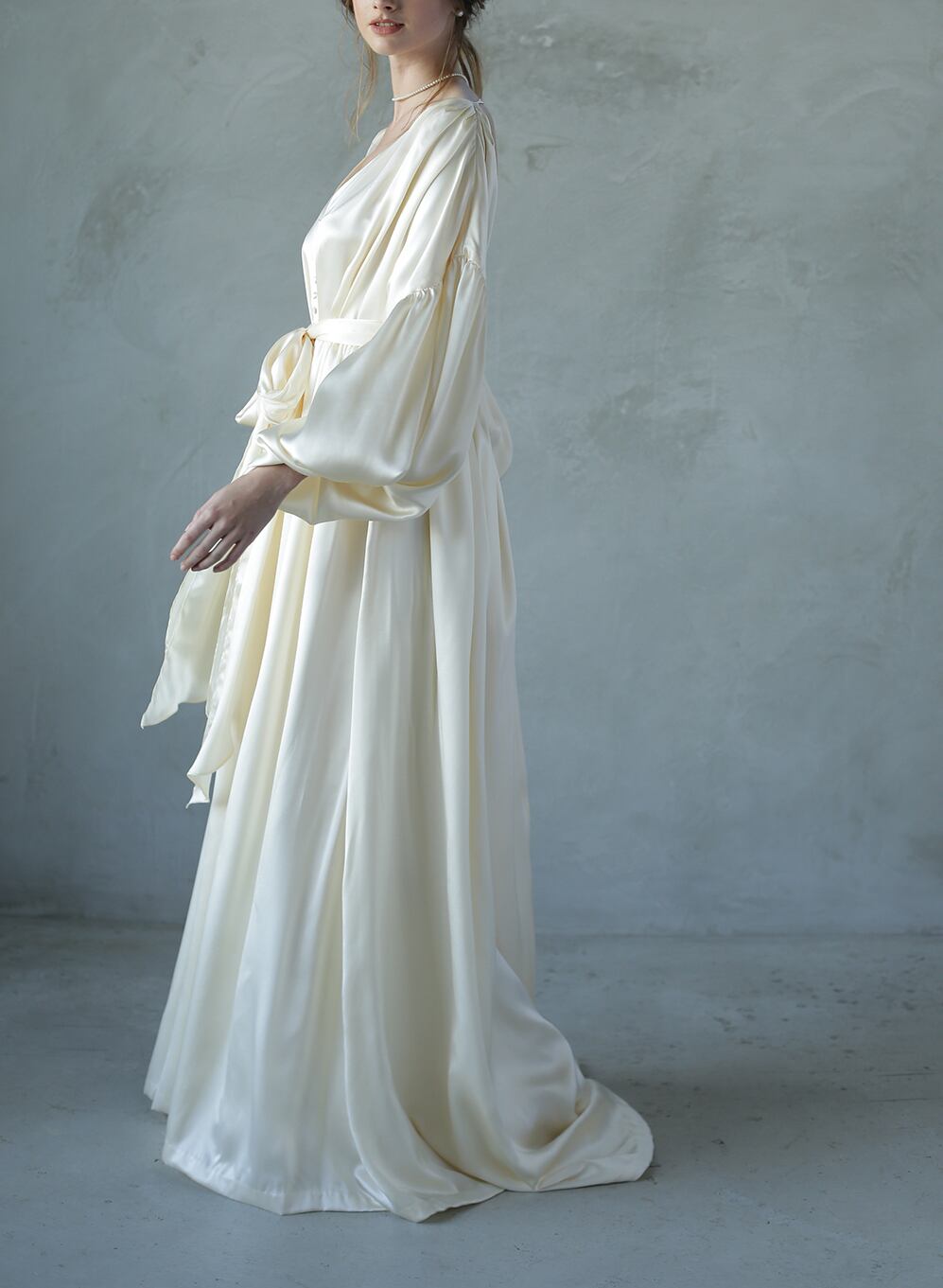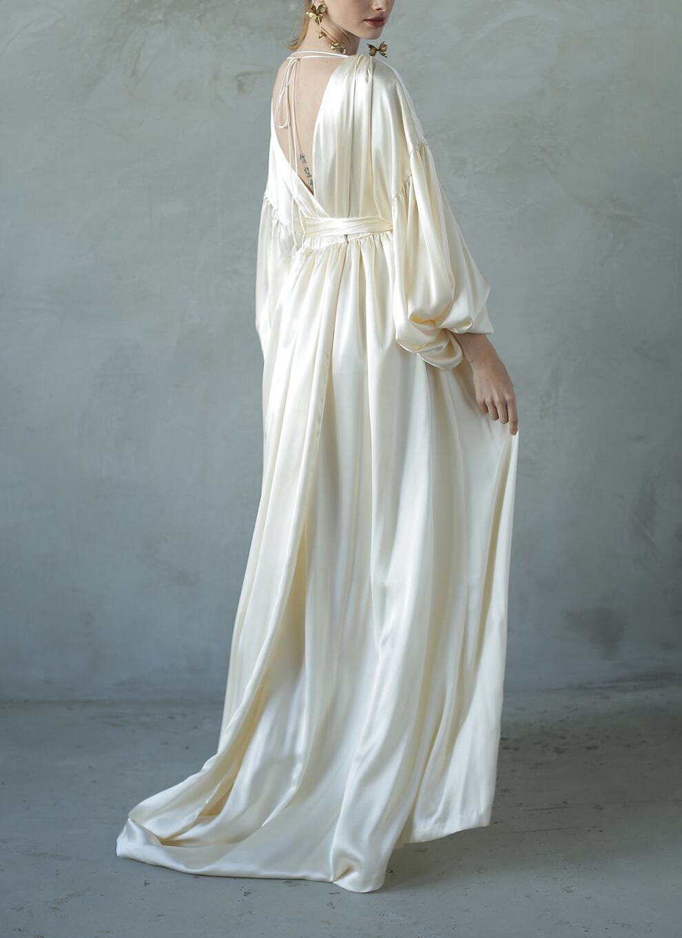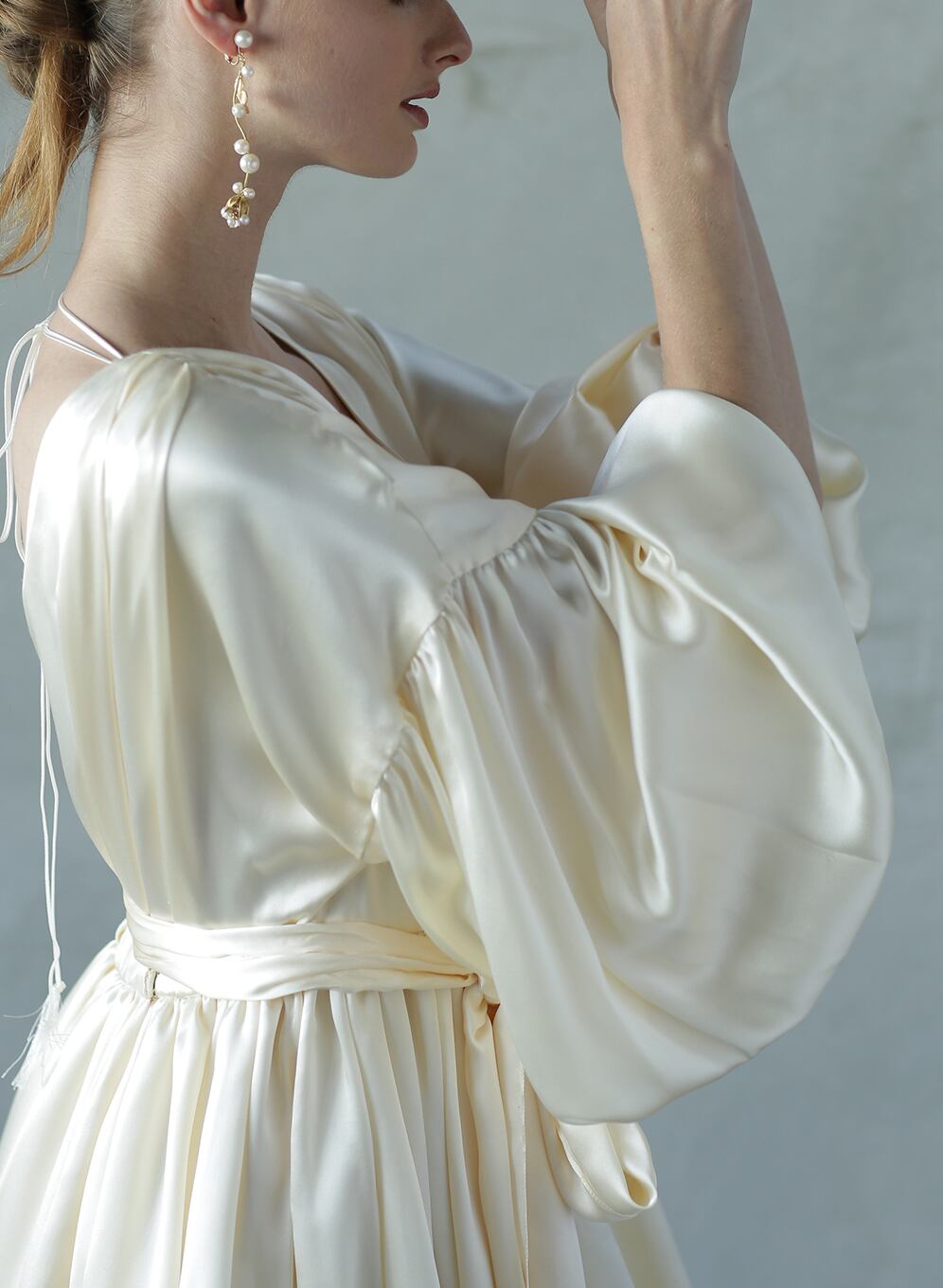 上品!ウエストリボン vネック トロミ感 シルク素材 パーティードレス ボリュームスリーブ 動きやすいドレス ウエディングドレス アイボリーカラードレス