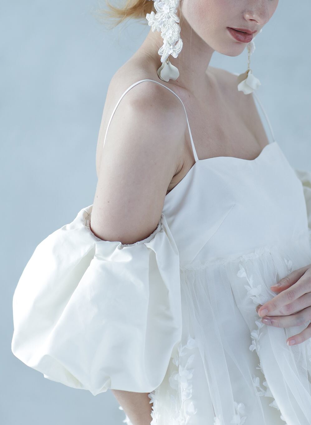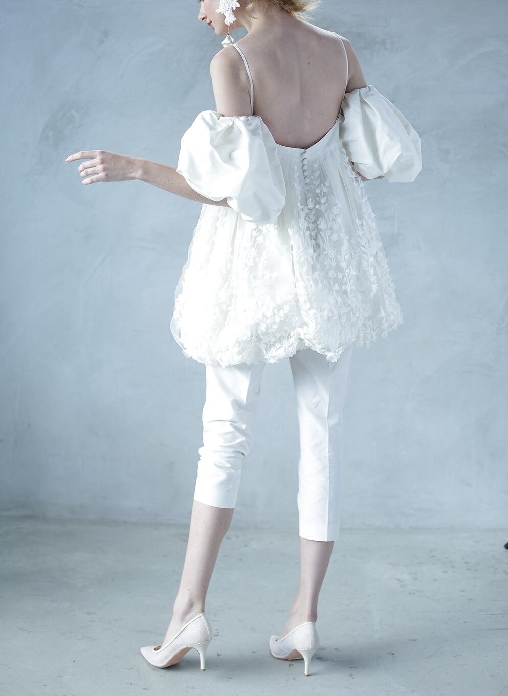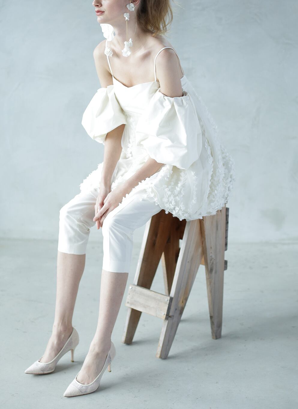 上品!ナチュラル ボリュームスリーブ バルーンTOPブラウスとパンツのセットアップ 3Dアップリケ パーティードレス 動きやすい 2次会 取り外し可能袖 | David1021k Dress(ダヴィドレス)