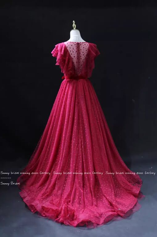 美品!ワイレッドカラードレス ラッフルフリル ドット柄チュールドレス パーティードレス Aラインドレス ダンスドレス 演奏会/イベント