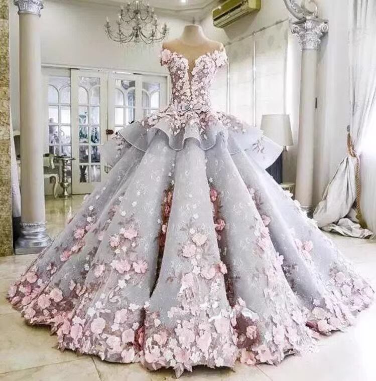 美品!フラワードレス ブルーグレー ピンクカラードレス ボリュームドレス 3Dアップリケ ウエディングドレス バックレス プリンセスライン