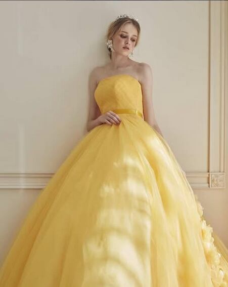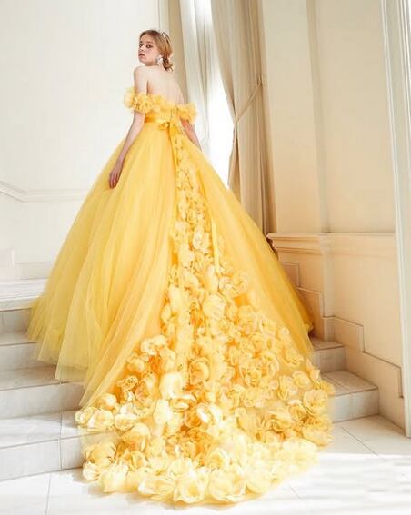 ゴージャス!イエローカラードレス 3Dフラワードレス フラワーオフショルダー 3Dアップリケ ウエディングドレス パーティードレス ハンドメイド 花嫁 結婚式/前撮り