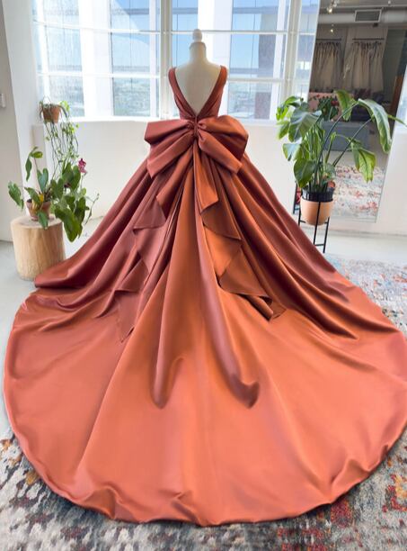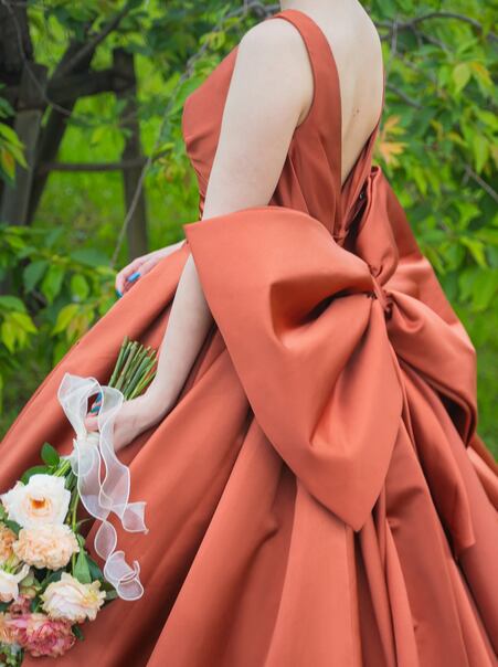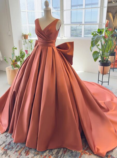 美品!テラコッタ色 カラードレス 大きなバックリボン ラッフルフリル パーティードレス ノースリーブ vネックドレス【色変更可能】
