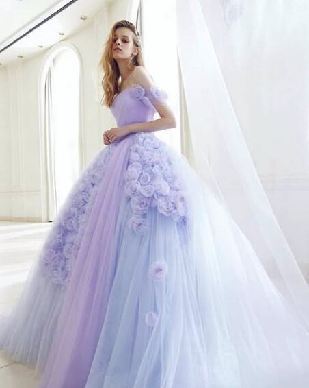 ゴージャス!ブルーパープル カラードレス 3Dフラワードレス グラデーション 3Dアップリケ ウエディングドレス パーティードレス ハンドメイド 花嫁 結婚式/前撮り