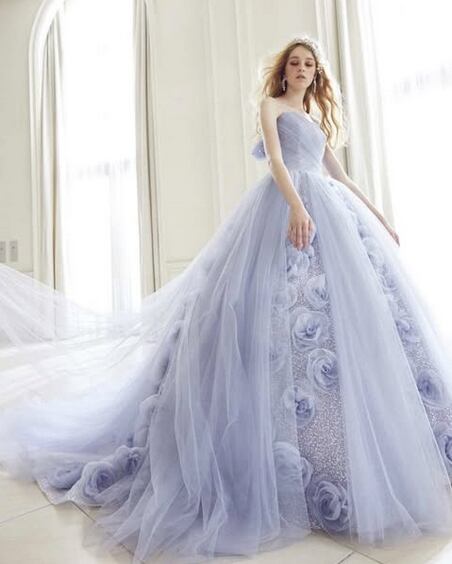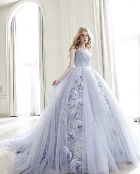 ゴージャス!ブルーグレー カラードレス ダスティブルー 3Dフラワードレス キラキララメチュール ウエディングドレス パーティードレス ハンドメイド 花嫁 結婚式/前撮り