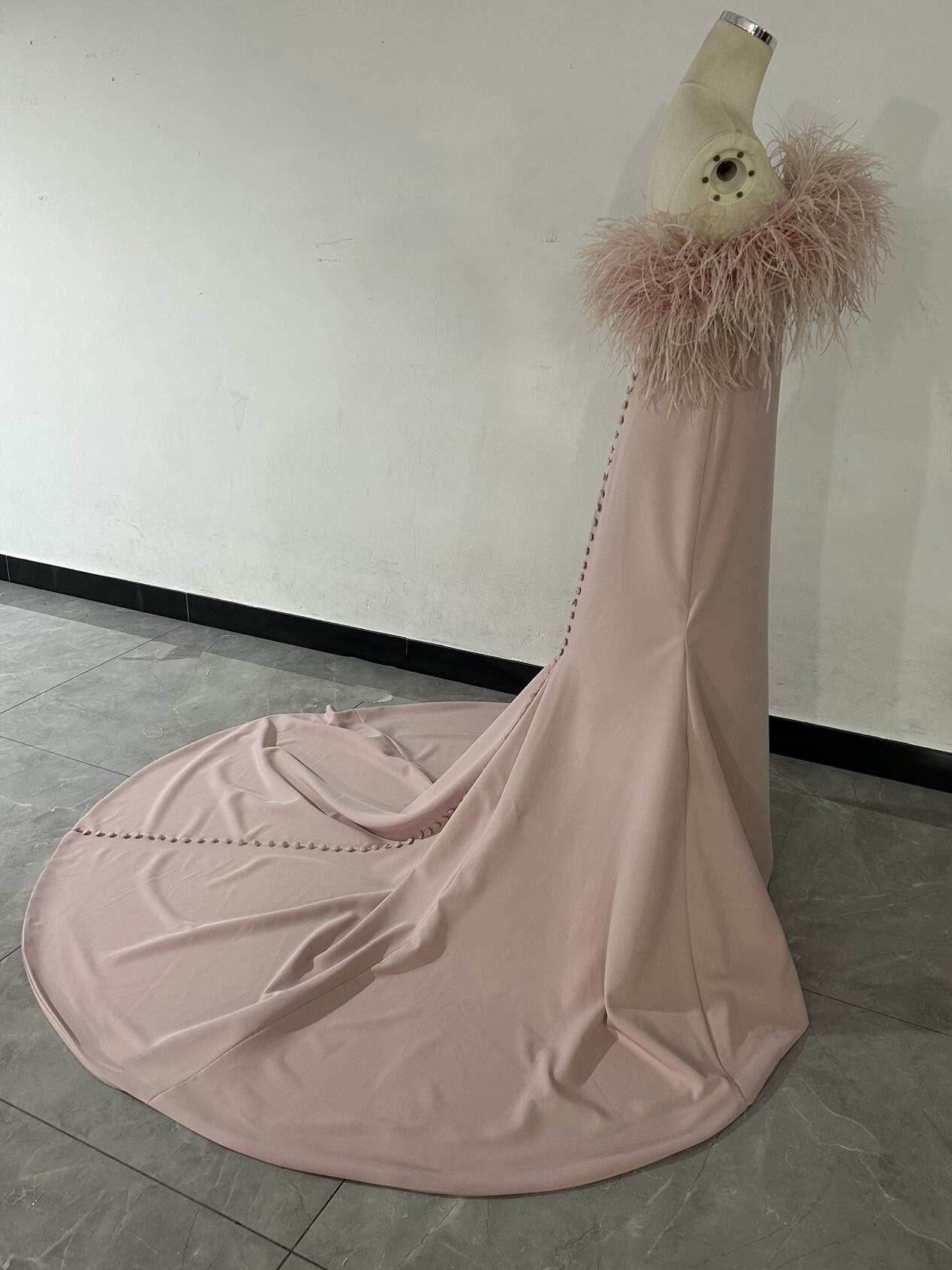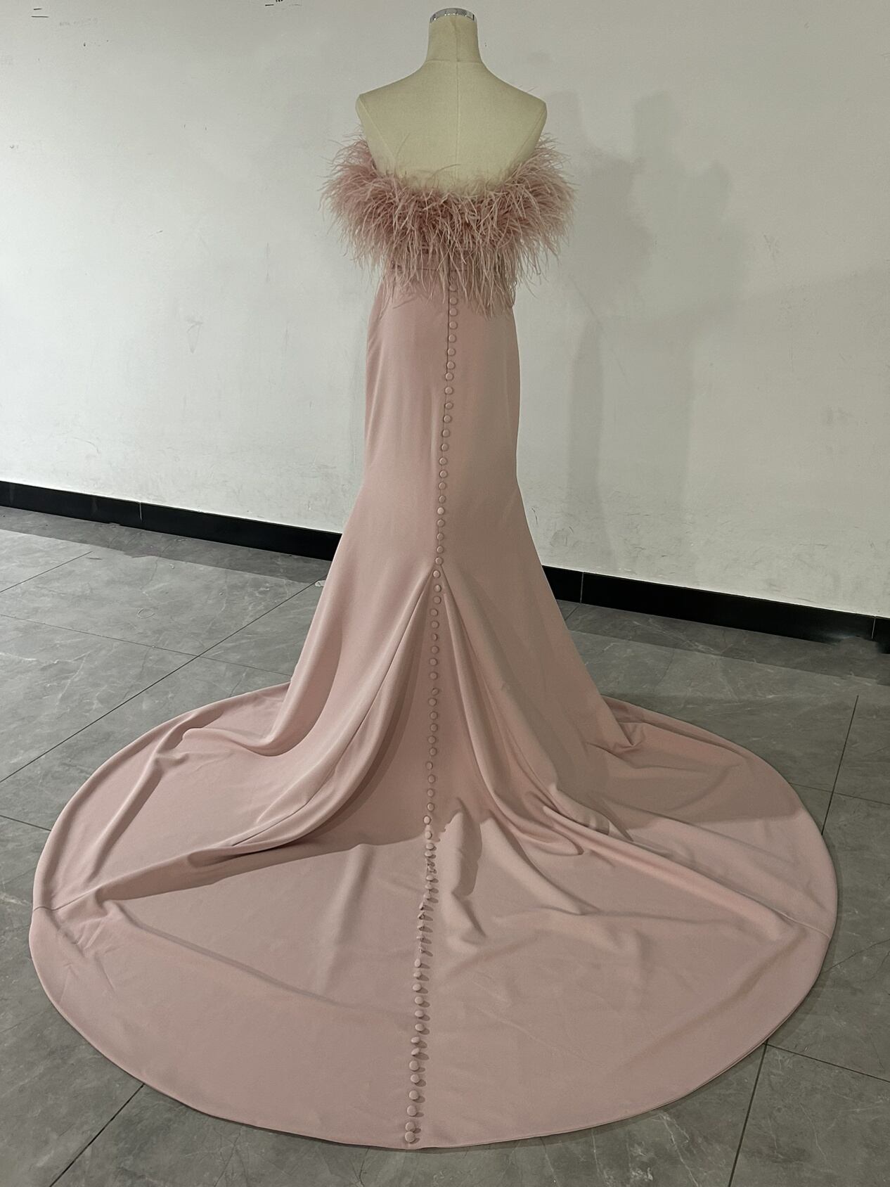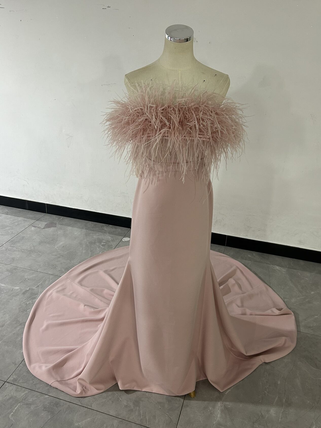 送料無料!ピンクカラードレス ファーフェザー オフショルダー ロングトレーン マーメイドパーティードレス 前撮り/花嫁