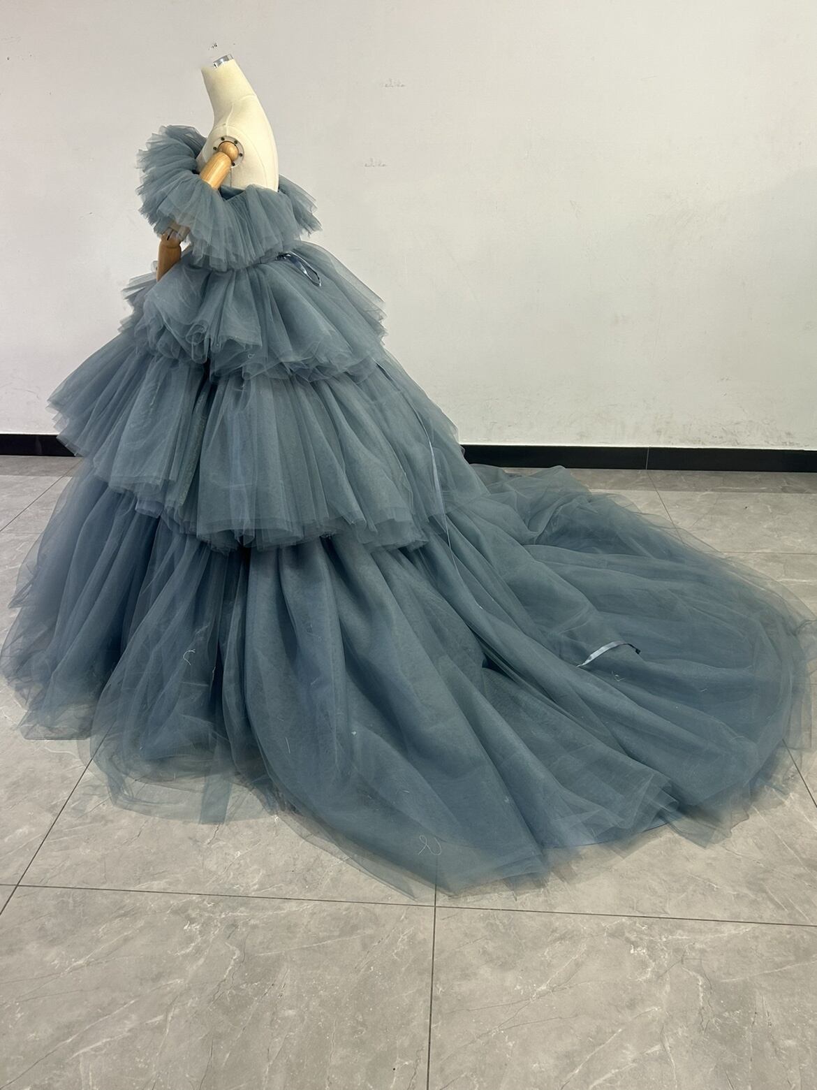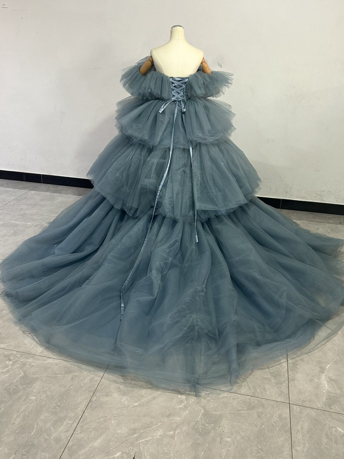 ブルーグレー もこもこチュールドレス カラードレス フリルオフショルダー お色直し ふわふわ ボリューム
