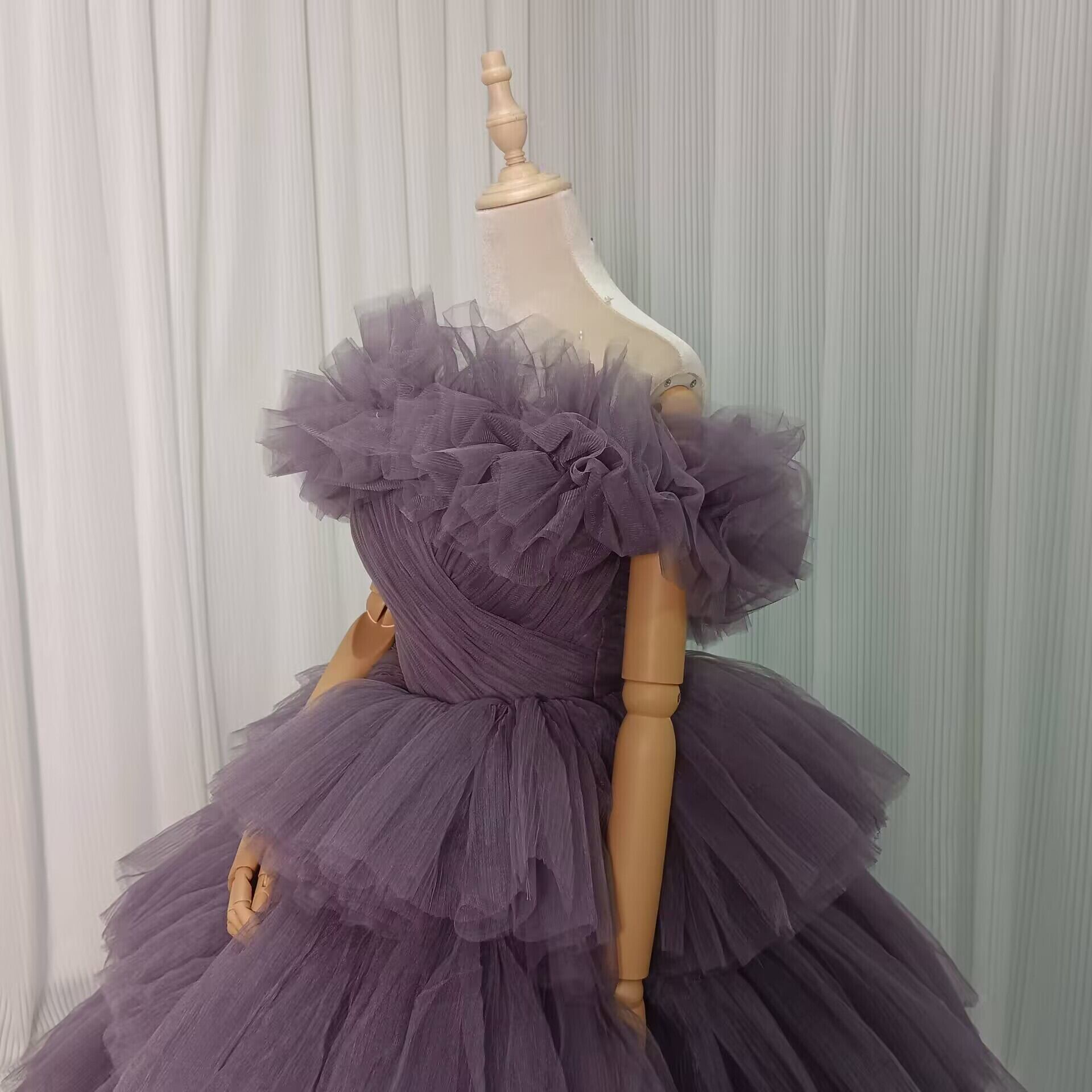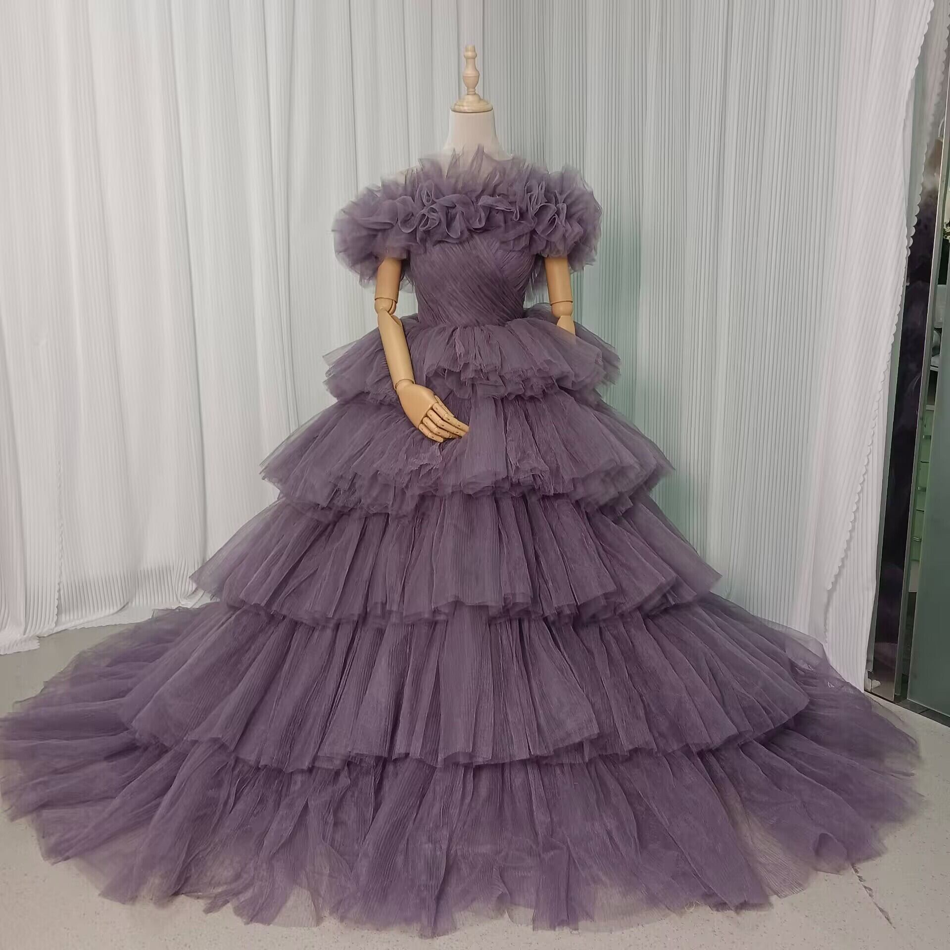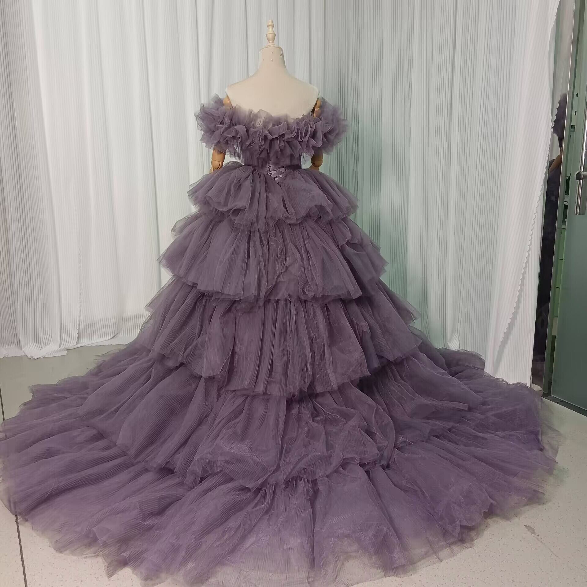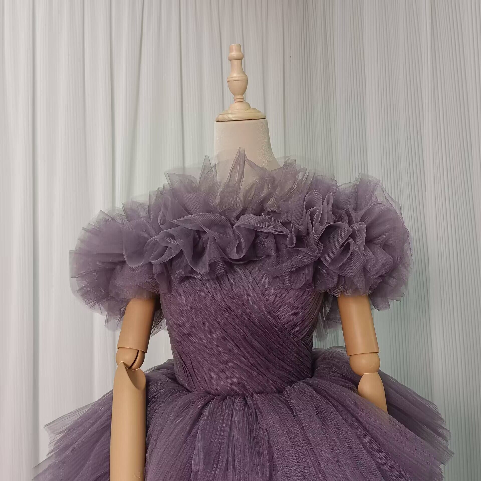 人気上昇!紫 取り外しオフショルダー もこもこチュールドレス ボリューム パフスリーブ 色オーダー可能