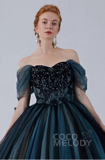 美品!繊細なビーズ刺繍 ブルー×ブラックのミックス色 カラードレス ビーディング 美しいバックスタイル シャーリング編み上げ パーティードレス