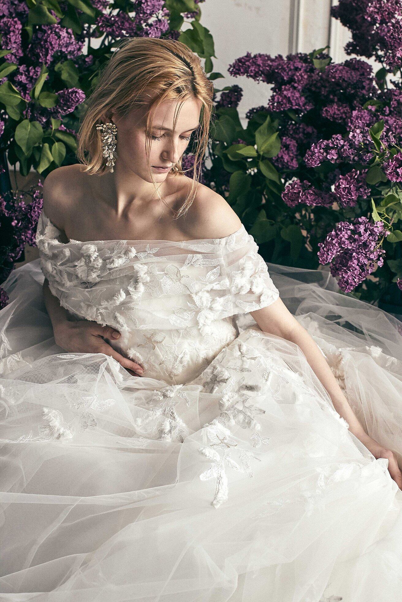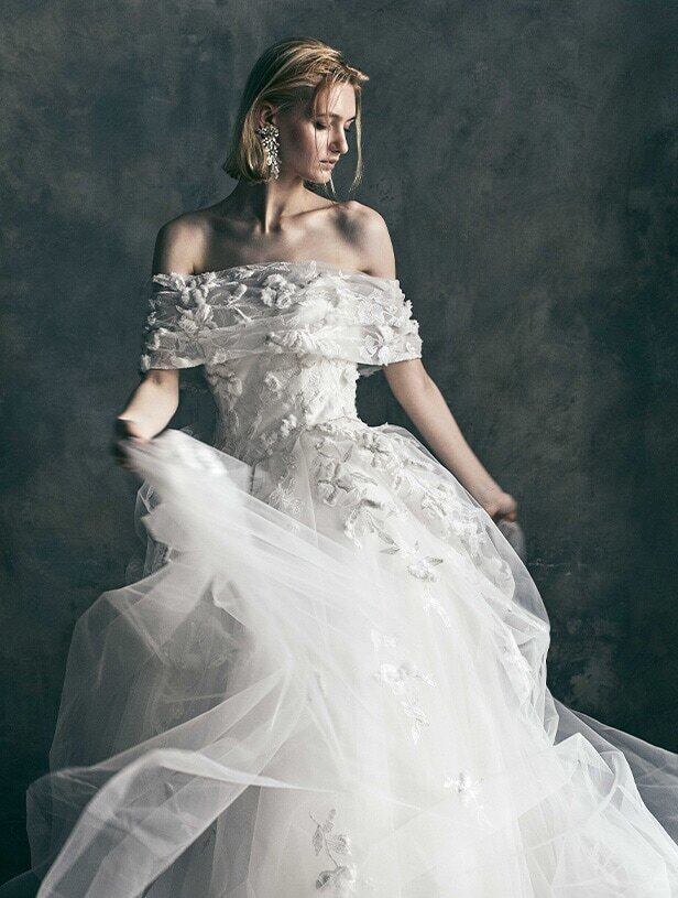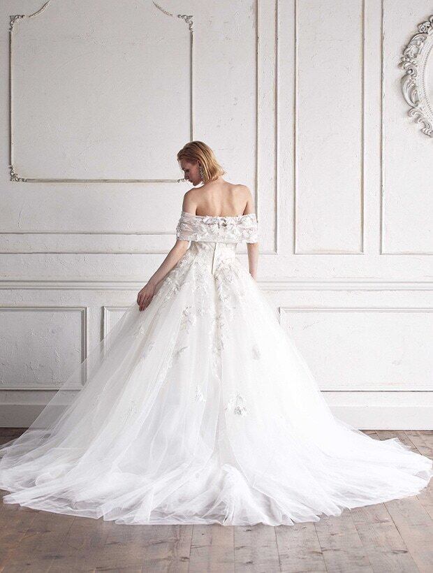 美品!3D立体レース刺繍 ウエディングドレス オフショルダー ロールカラー チュールドレス プリンセスライン パーティードレス ボリュームドレス