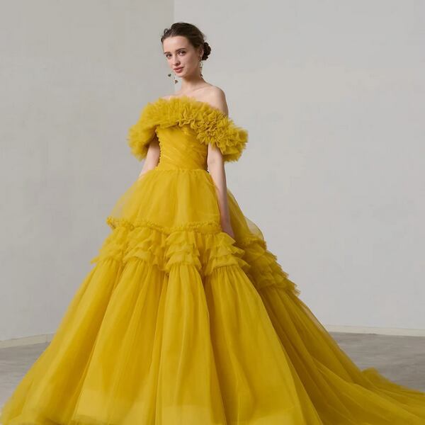 美品!イエローカラードレス フリルオフショルダー アームカバー ふんわりチュールドレス パーティードレス イブニングドレス【色変更可能】