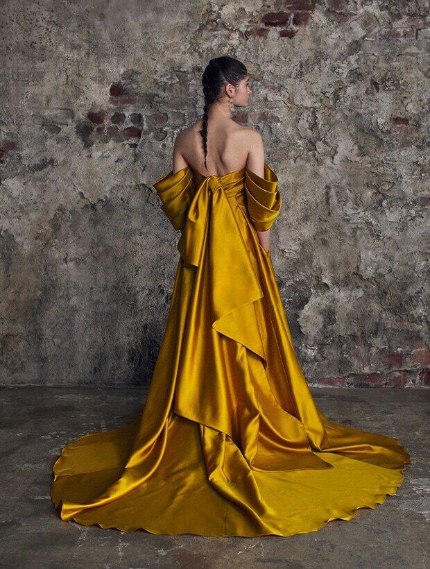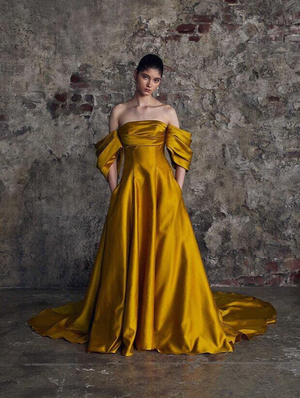 美品!マスタード色 イエローカラードレス 取り外し袖 バックスタイル 光沢サテン パーティードレス イブニングドレス【色変更可能】