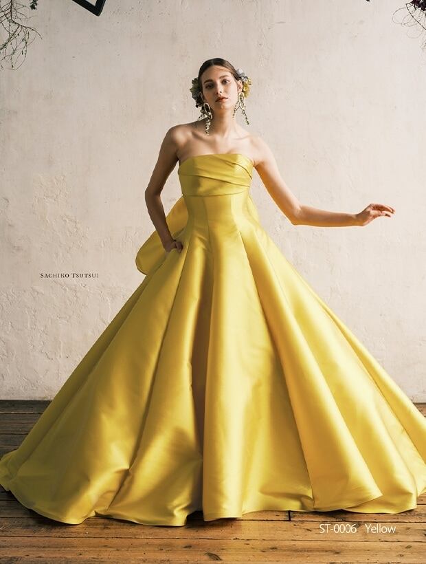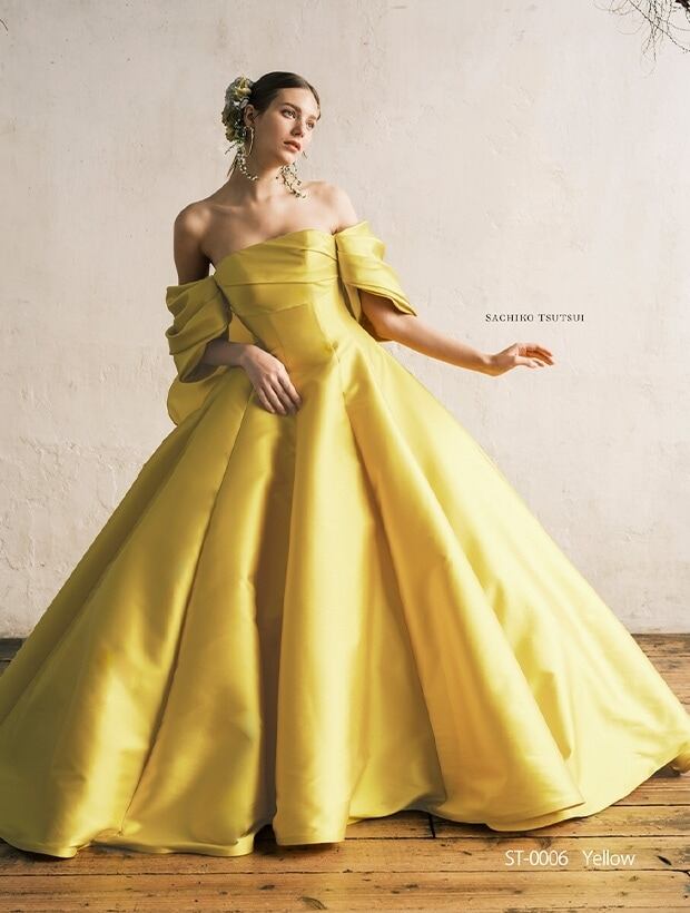 美品!イエローカラードレス 取り外し袖 フリルバックスタイル 光沢サテン パーティードレス イブニングドレス【色変更可能】