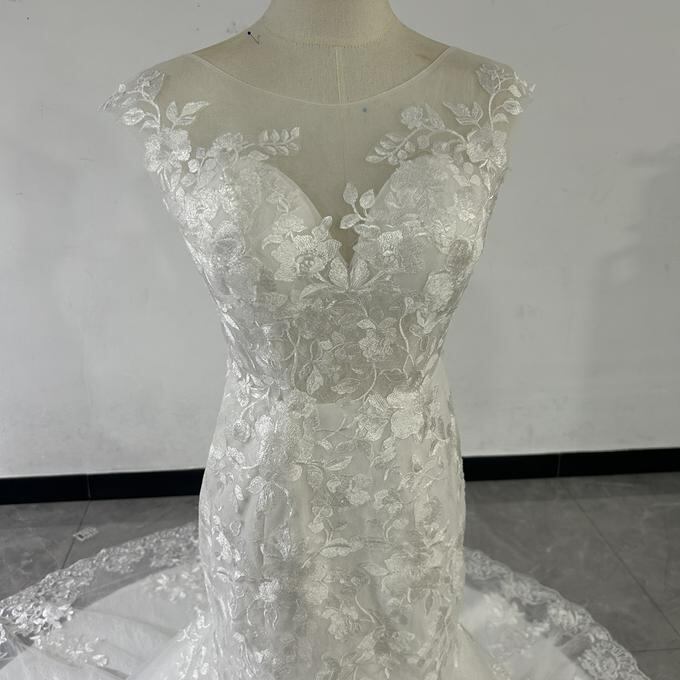 実例写真 抜群のおしゃれ見え ホワイト ウエディングドレス 3D立体レース刺繍 マーメイドライン華やかなトレーン パーティードレス 演奏会