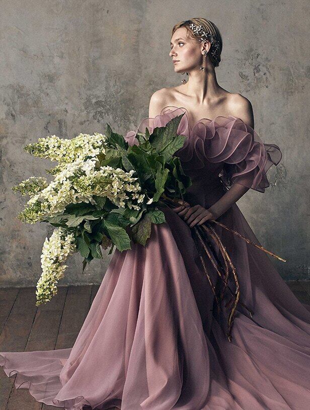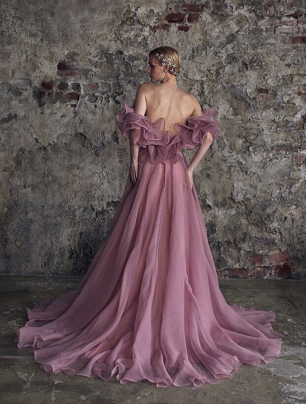 美品!ピンク紫 カラードレス スモーキーピンク フリルオフショルダー パーティードレス ダンスドレス ミディアムドレス イブニングドレス【色変更可能】 | David1021k Dress(ダヴィドレス)