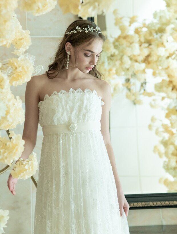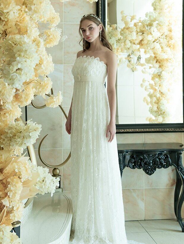 美品!ビスチェスタイル ウエディングドレス エンパイアライン ビーディング 総レースドレス パーティードレス 妊婦ドレス スレンダーライン