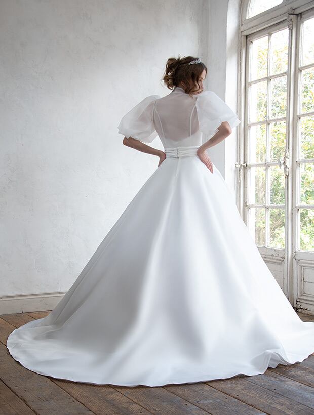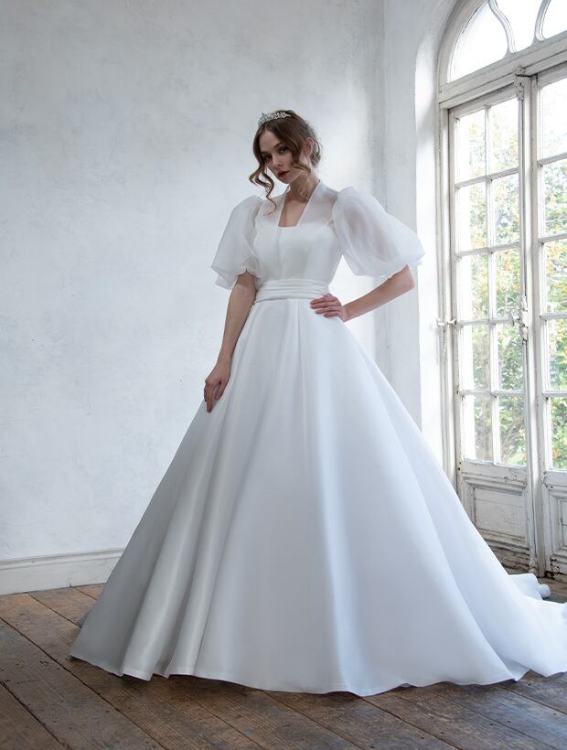 美品!パフスリーブ トップス ビスチェドレス 2WAYウエディングドレス サテンドレス パーティードレス プリンセスライン 花嫁/前撮り