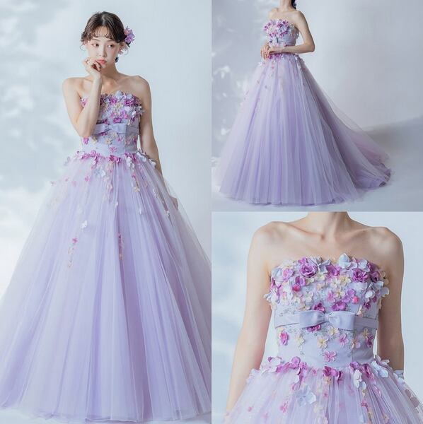 美品!造花ドレス フラワードレス ラベンダー色 パープルカラードレス 3Dフラワーモチーフ ビスチェドレス ダンスドレス パーティードレス ピアノ演奏ドレス | David1021k Dress(ダヴィドレス)
