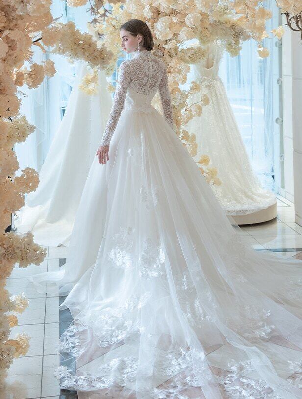 美品!レースアップリケ 上品レースボレロ ウエディングドレス ロングスリーブ ビスチェスタイル パーティードレス ハートネック 花嫁/前撮り