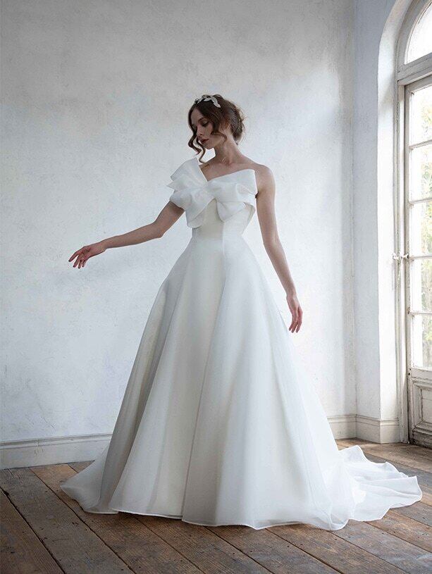 美品!リボン ビスチェスタイル ウエディングドレス オフホワイト Aラインドレス パーティードレス シルクドレス 花嫁/前撮り
