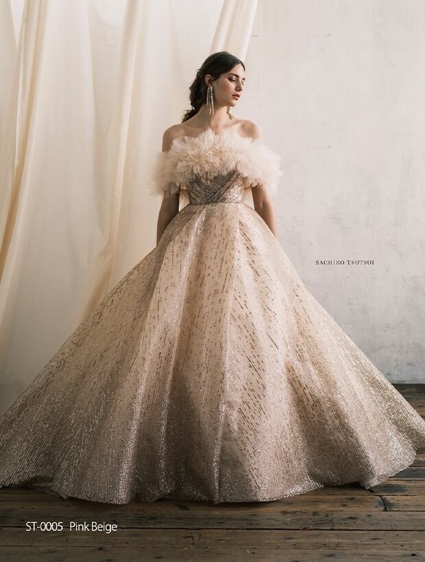 美品!シャンパンカラードレス ふわふわオフショルダー ロールカラー キラキララメチュールドレス Aラインドレス パーティードレス ミディアムドレス