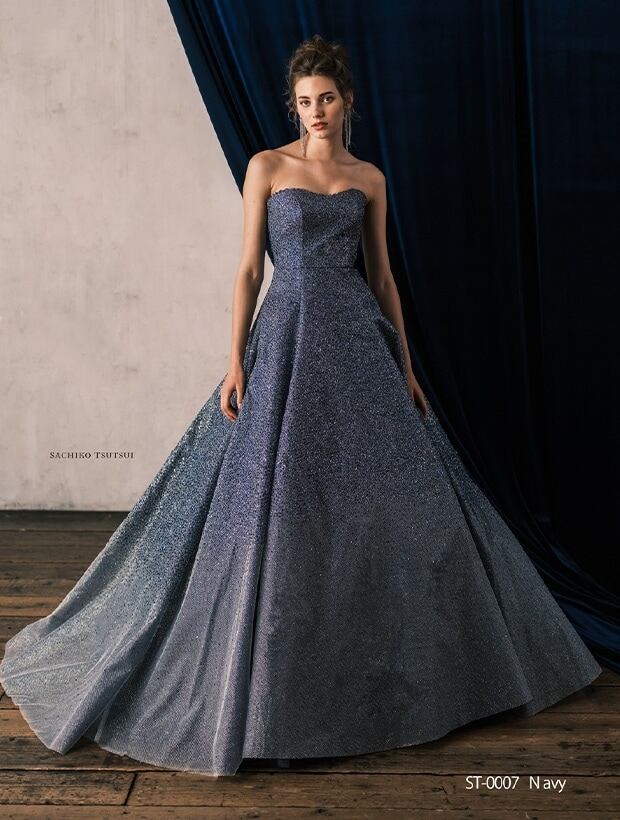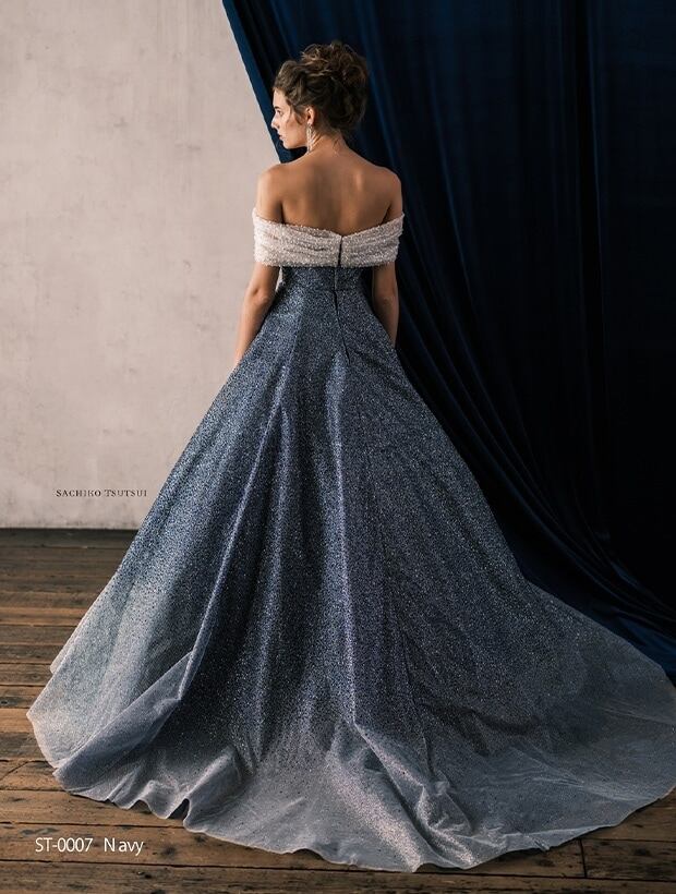 美品!キラキラ星空ドレス ダークブルーカラードレス オフショルダー ロールカラー ビスチェスタイル Aラインドレス パーティードレス ミディアムドレス