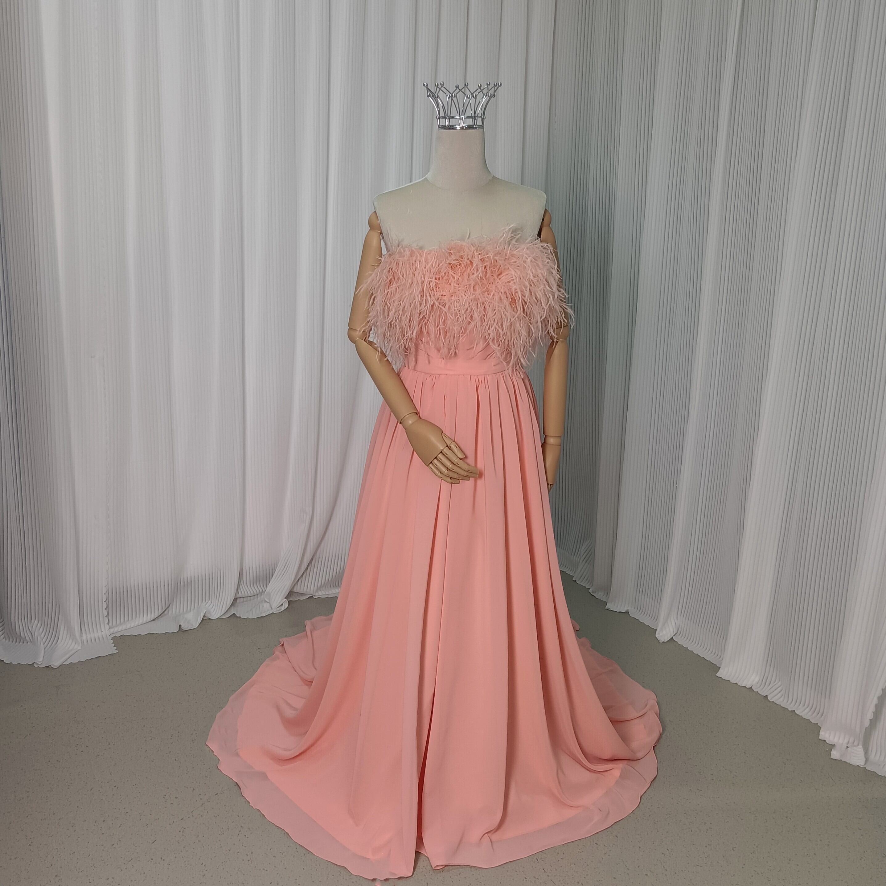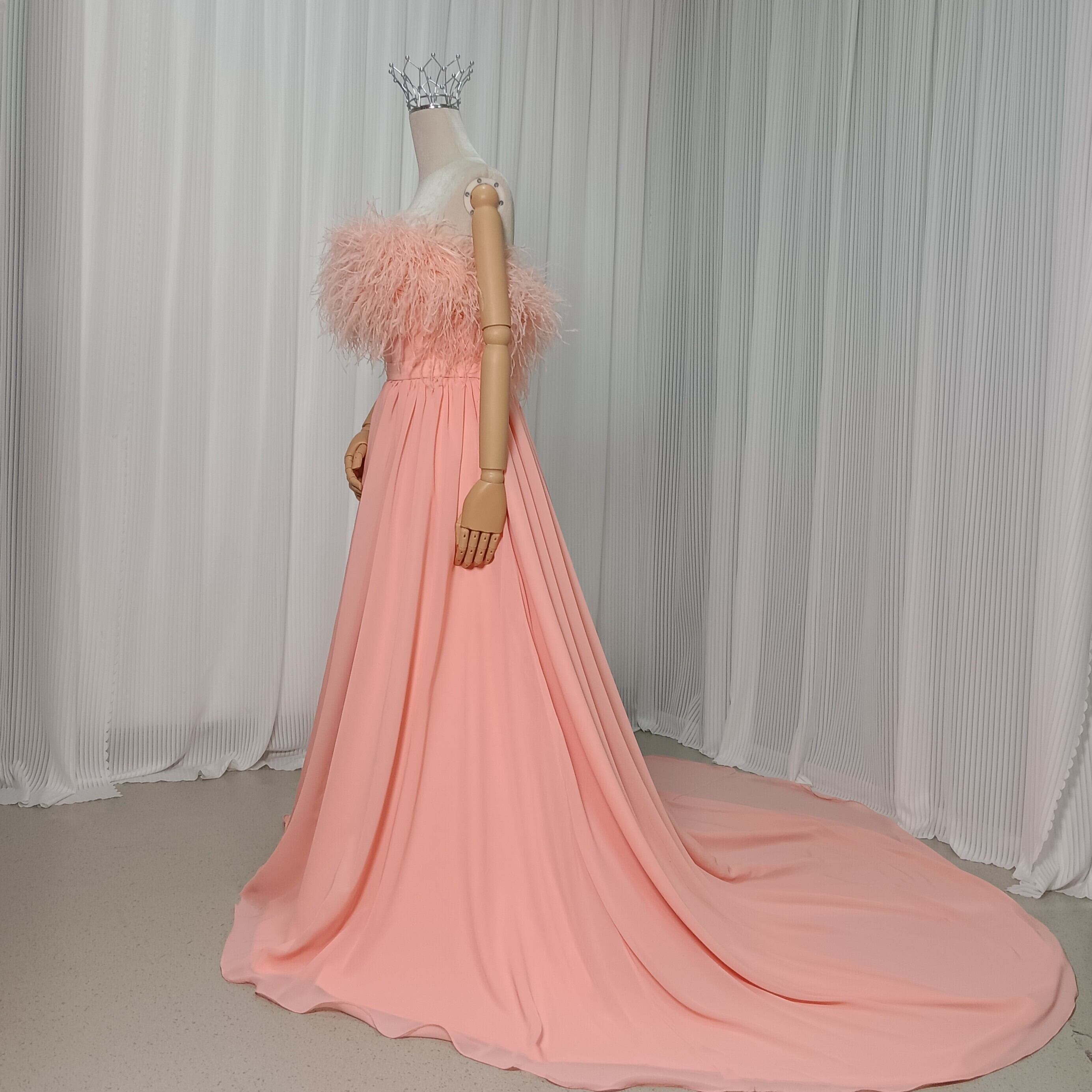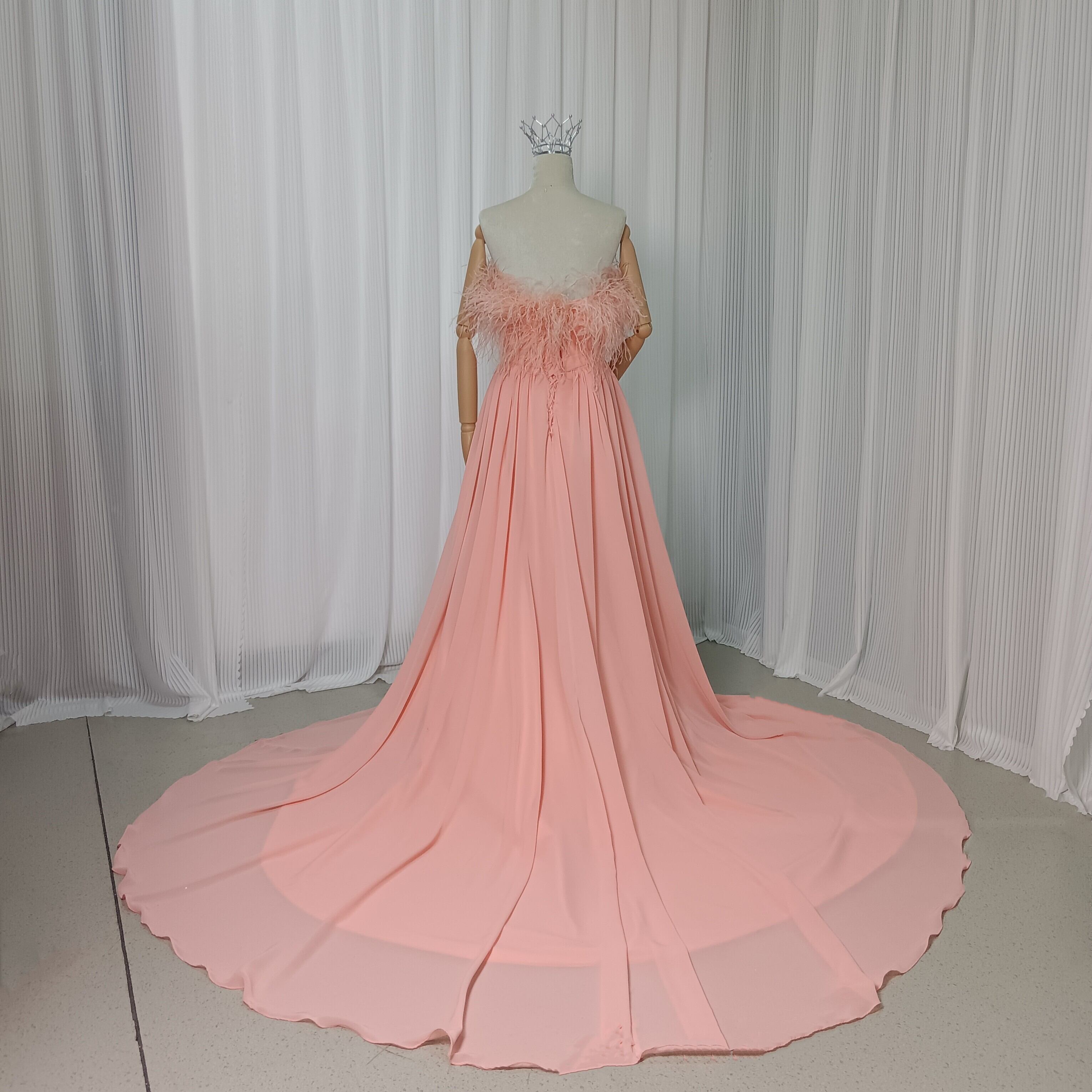 送料無料!ピンクカラードレス ファーフェザー オフショルダー ロングトレーン マーメイドパーティードレス 前撮り/花嫁