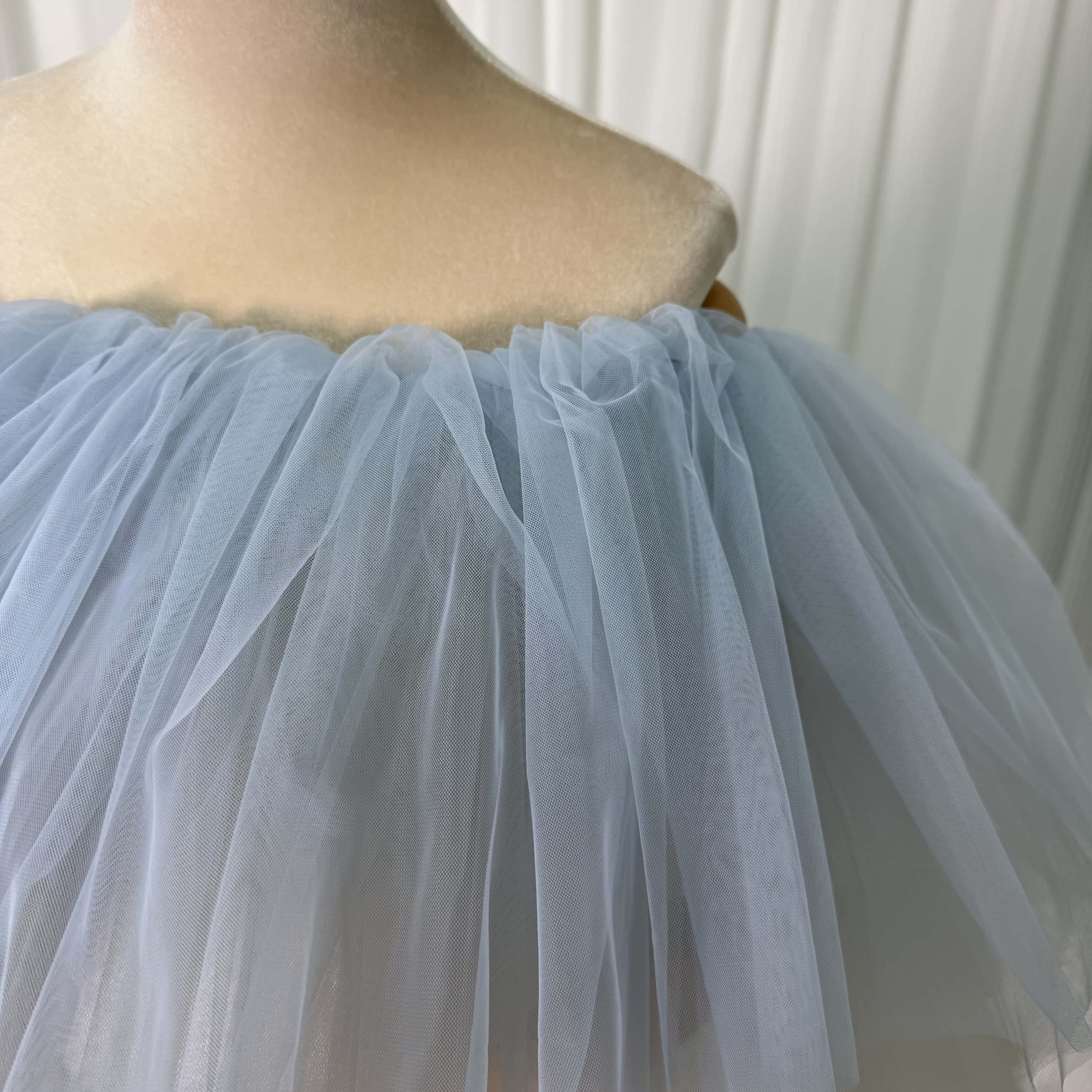 送料無料! 人気上昇!ブルーグレー 取り外しオフショルダー ポンチョ ソフトチュール ラッフルフリル