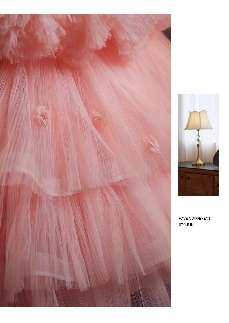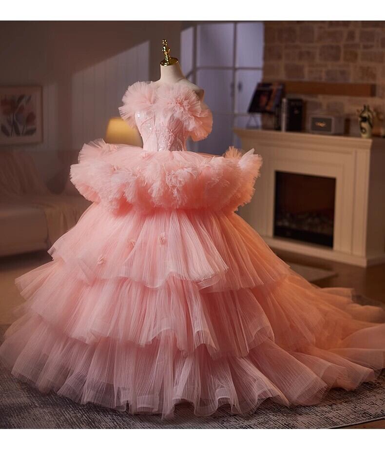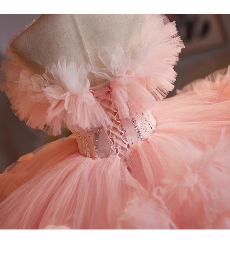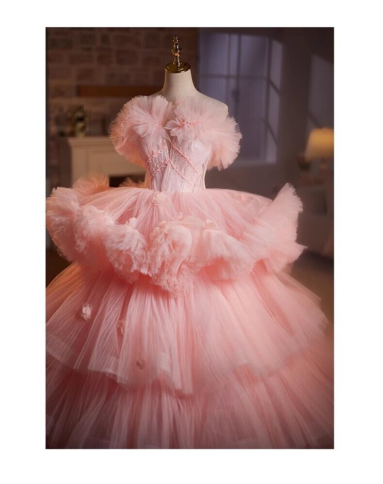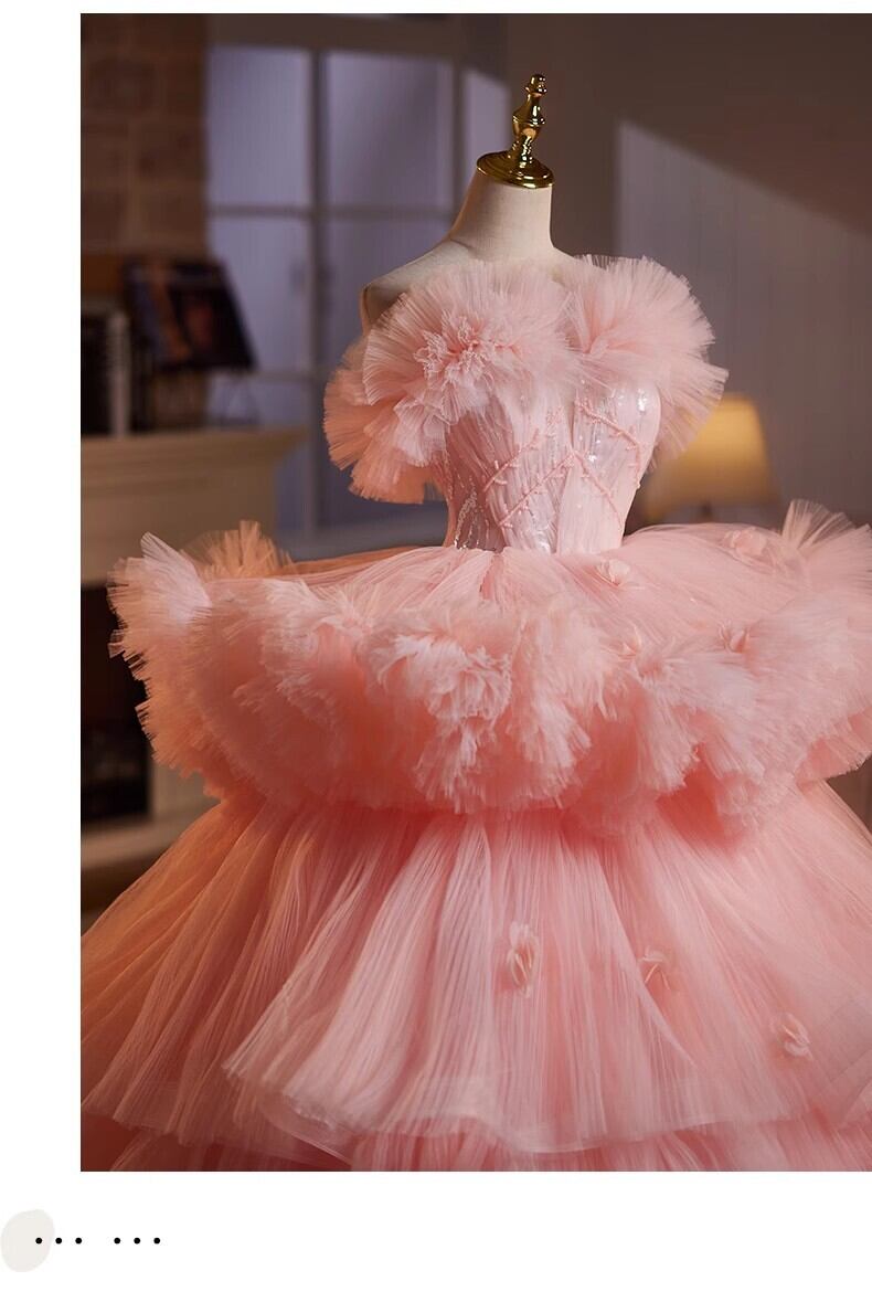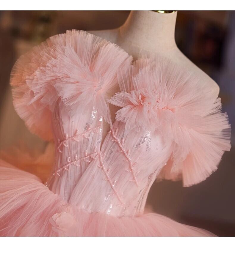 美品!ピンク ラッフルフリル カラードレス ふわふわオフショルダー もこもこチュールドレス パーティードレス フリルドレス【色変更可能】