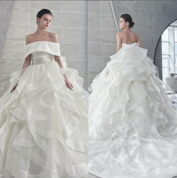 美品!3WAYウエディングドレス 韓国風ドレス ラッフルフリルドレス ホースヘア パーティードレス ロールカラー アシメドレス【色変更可能】