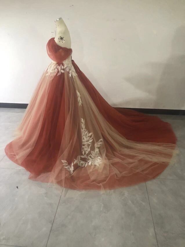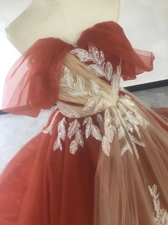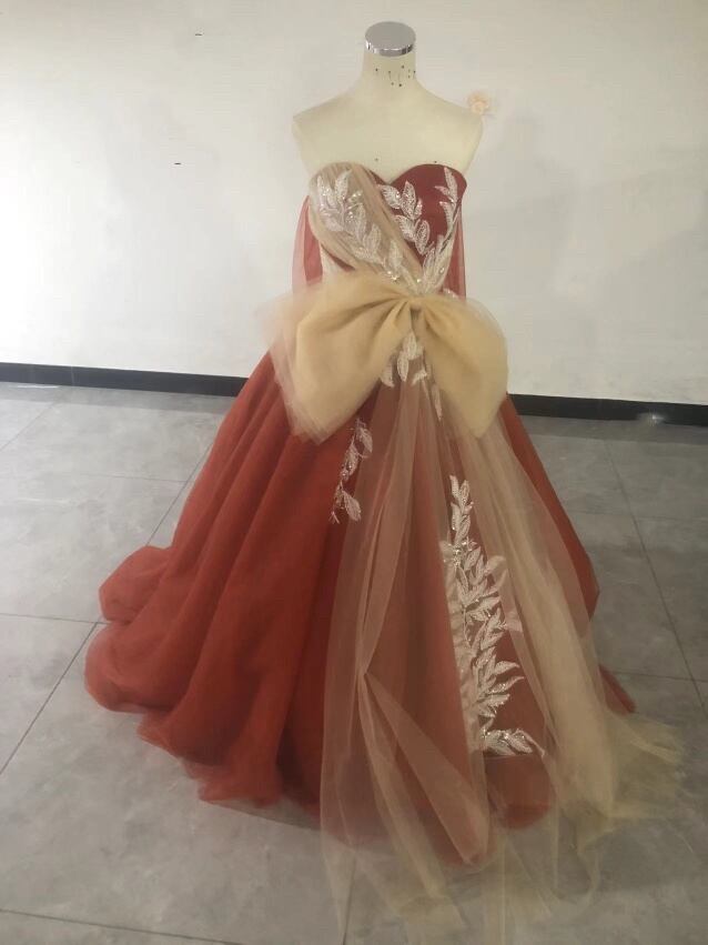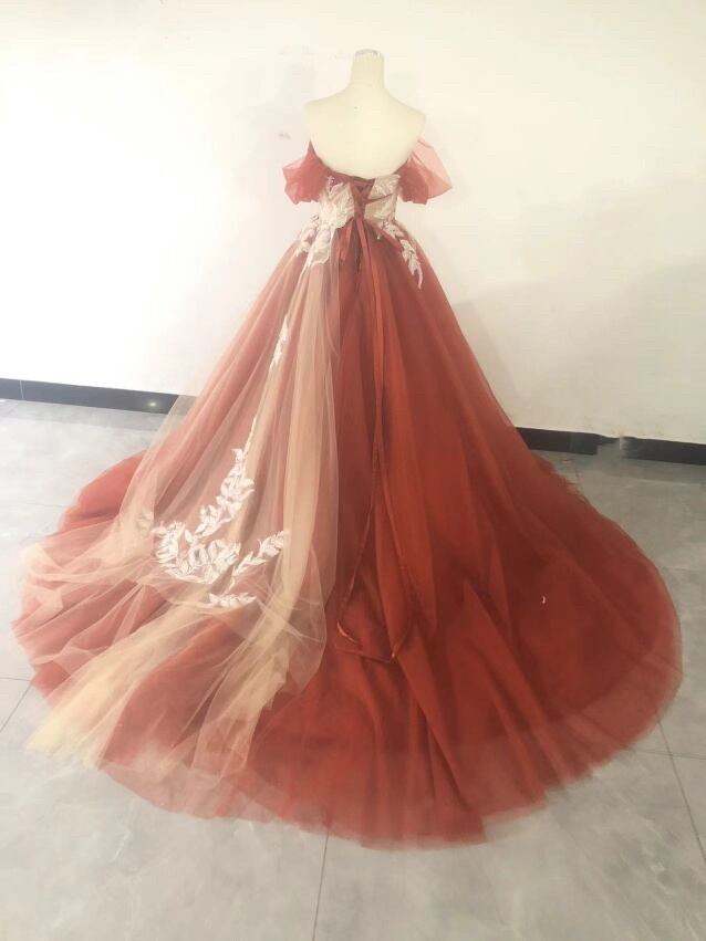 高品質!2色カラードレス テラコッタ色 グラデーション オフショルダー ソフトチュール レースアップリケ ウエストリボン 花柄のモチーフ刺繍が美しく ハンドメイド オーダードレス 花嫁 結婚式/前撮り