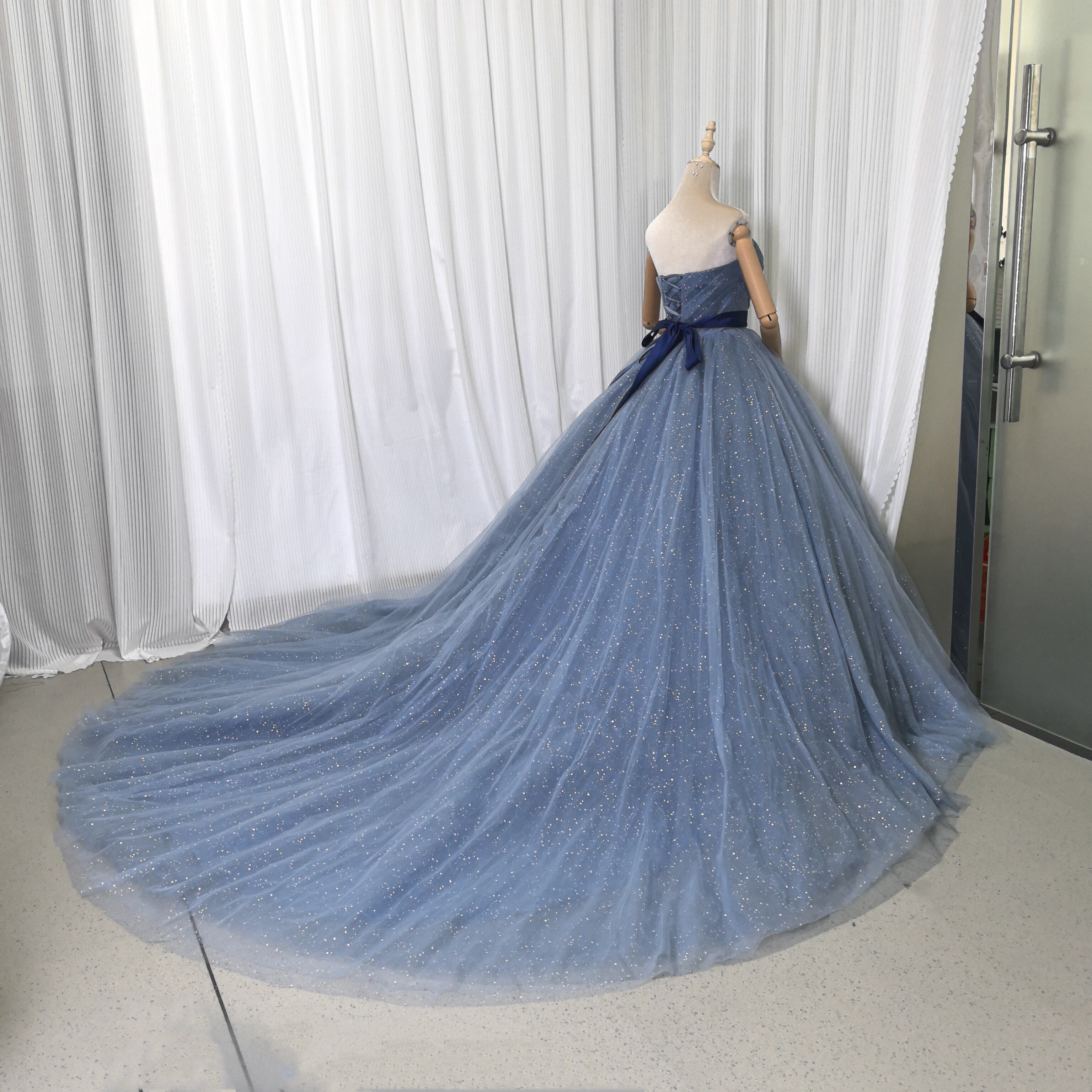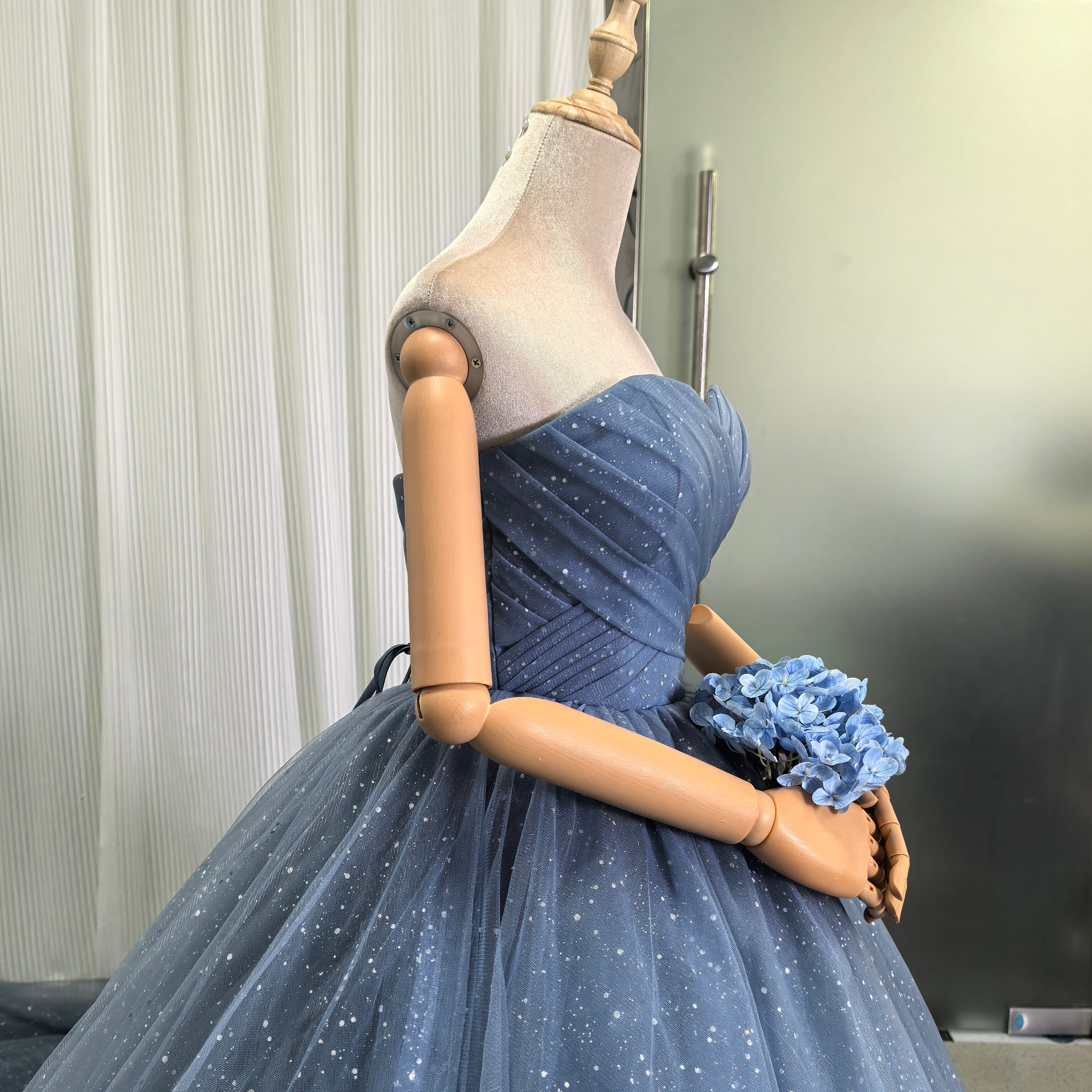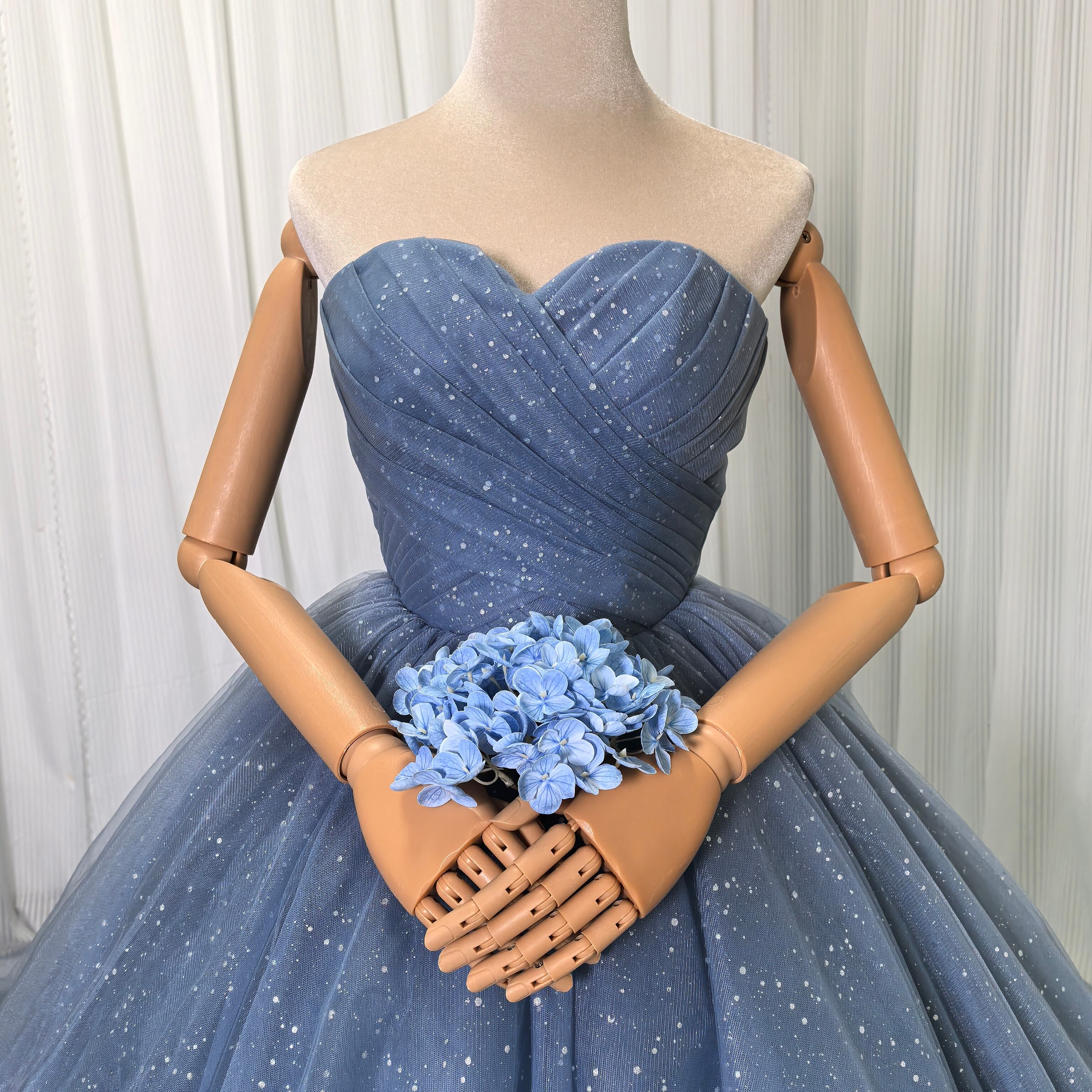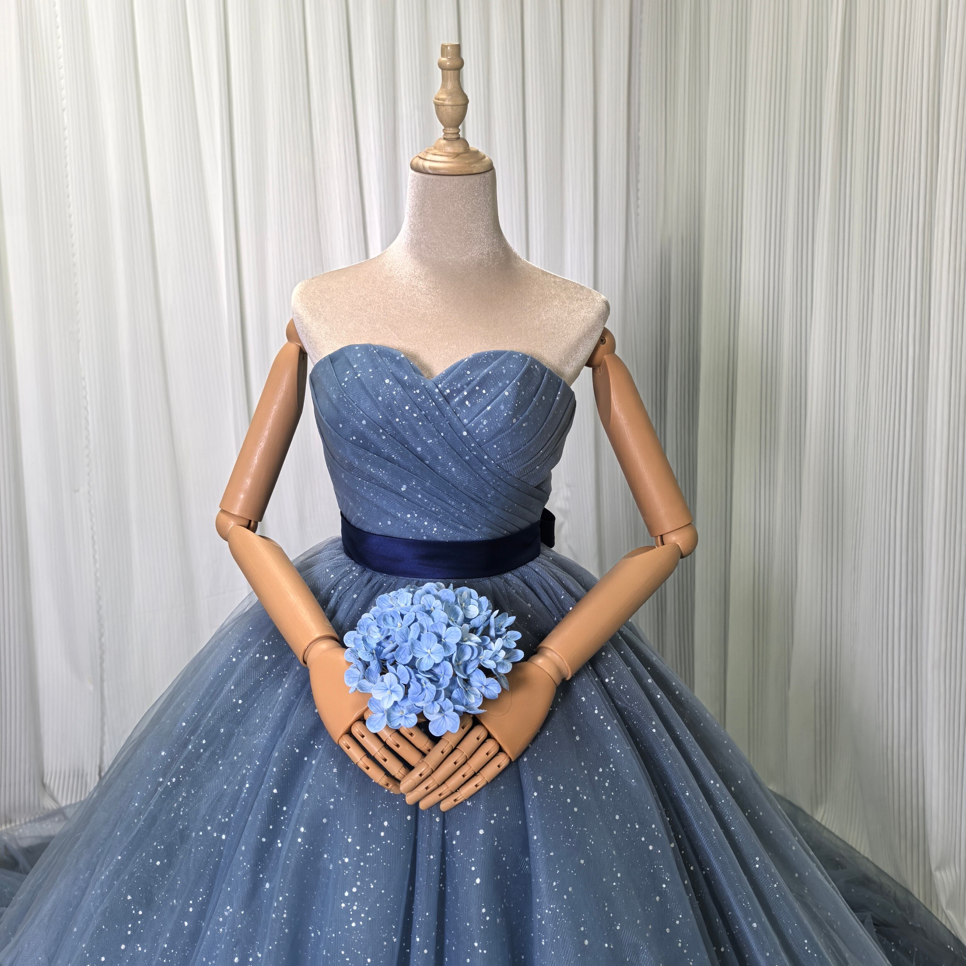 送料無料!ブルーグレー ベアトップ カラードレス ソフトチュール  フレアスカート 前撮り/花嫁