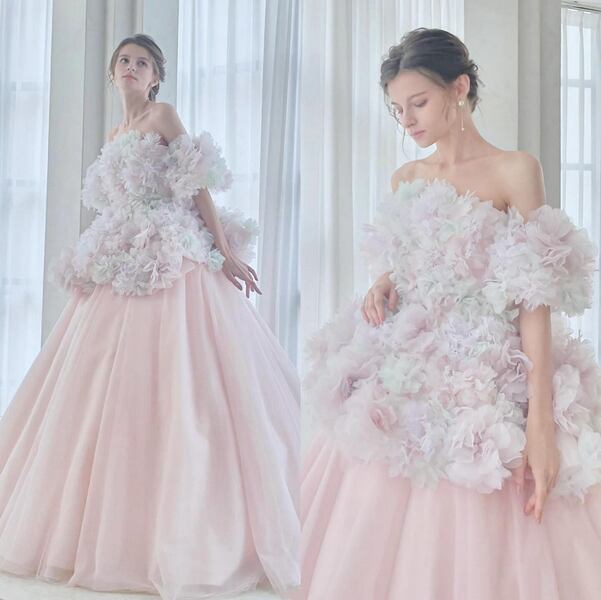 美品!薄ピンク ふわふわカラードレス 付け袖 Aラインドレス パーティードレス ミディアムドレス フリルドレス【色変更可能】