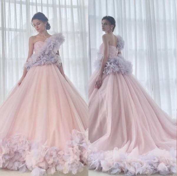 美品!ピンク紫 ワンショルダー もふもふカラードレス ラッフルフリル パーティードレス ミディアムドレス フリルドレス【色変更可能】
