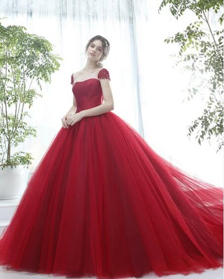美品!レッドカラードレス ふんわりチュールドレス プリンセスライン パーティードレス ミディアムドレス【色変更可能】