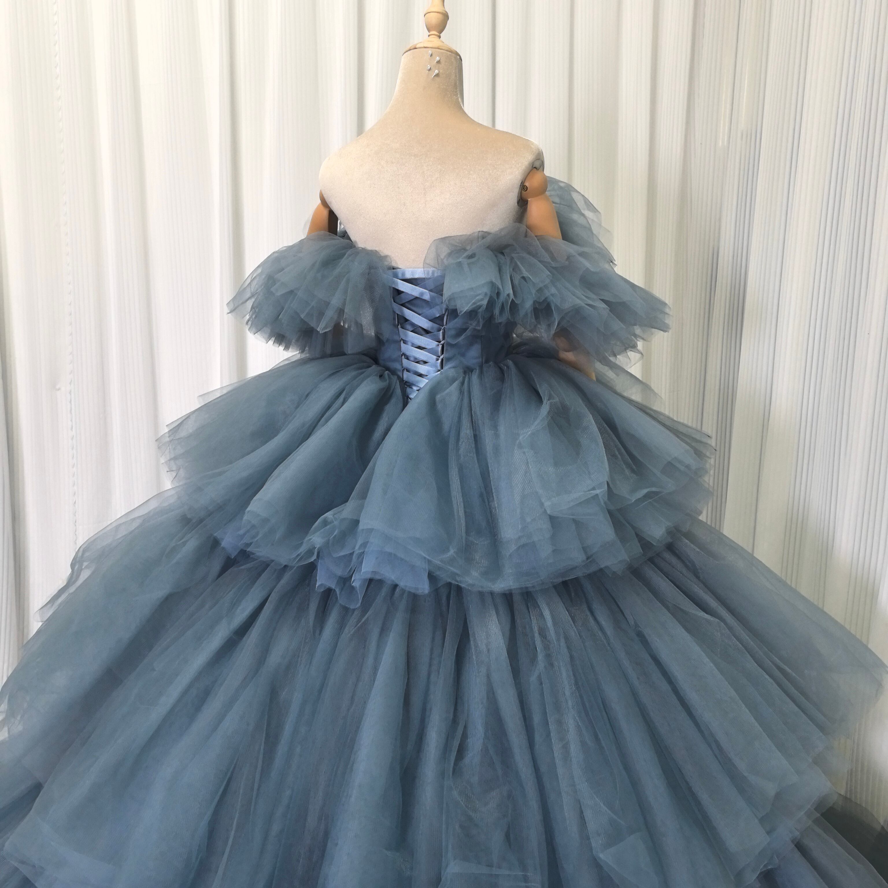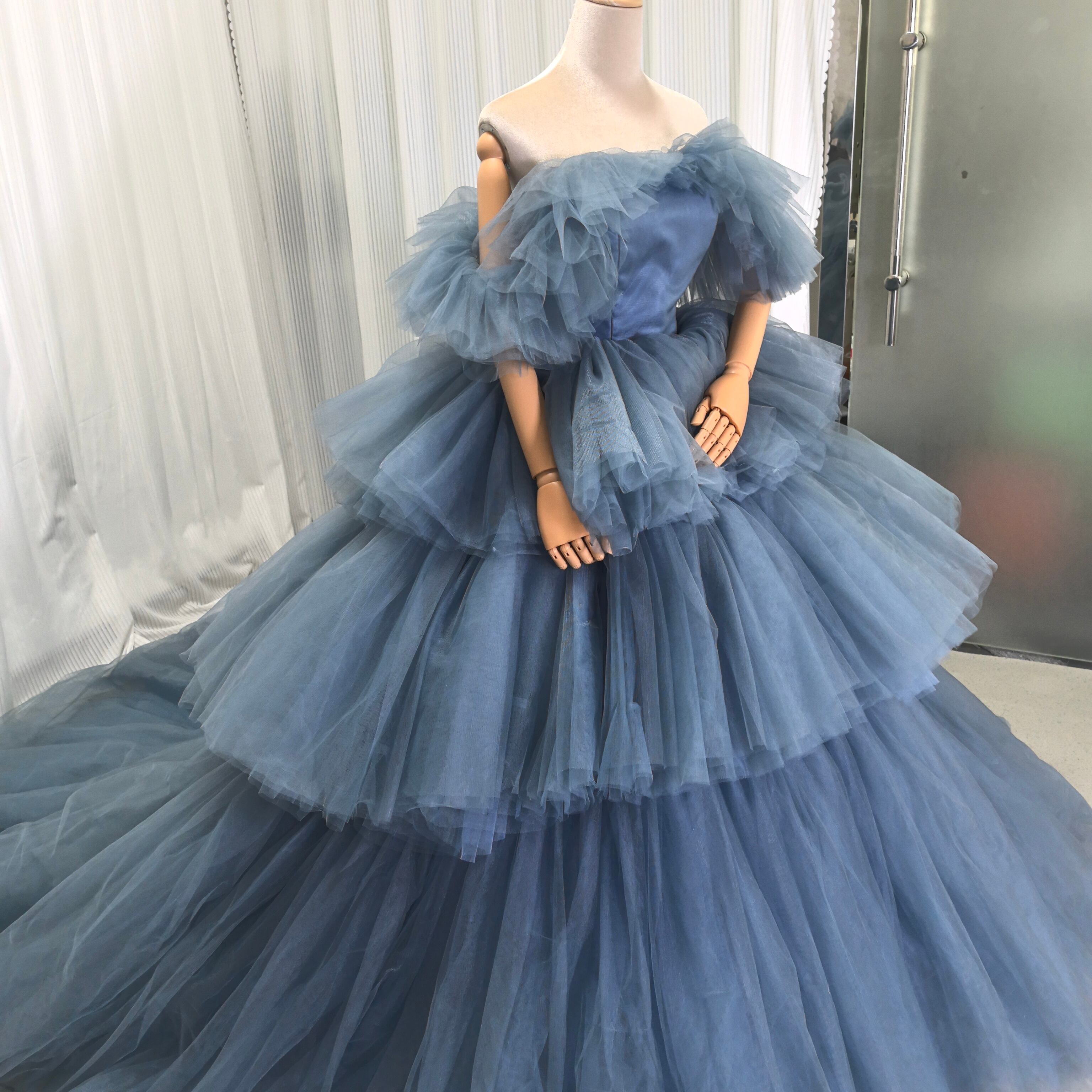 ブルーグレー もこもこチュールドレス カラードレス フリルオフショルダー お色直し ふわふわ ボリュームパニエあり