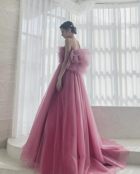 美品!チェリーピンク カラードレス ふわふわバックリボン ふんわりチュールドレス パーティードレス Aラインドレス【色変更可能】