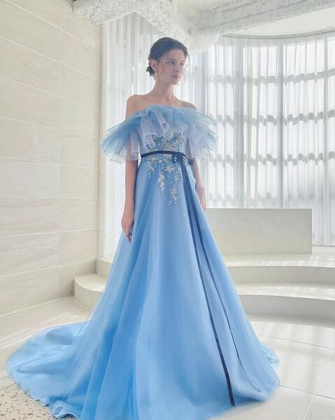 美品!水色 ブルーカラードレス ウエストリボン フリルオフショルダー パーティードレス ミディアムドレス 演奏ドレス【色変更可能】