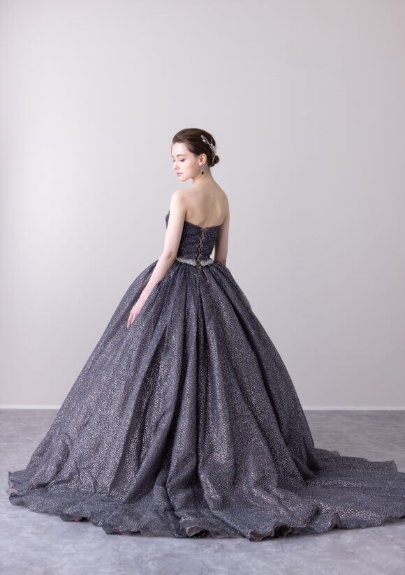 美品!キラキラグリッターチュール ブラックカラードレス ウエストスタイル プリンセスライン パーティードレス ミディアムドレス【色変更可能】