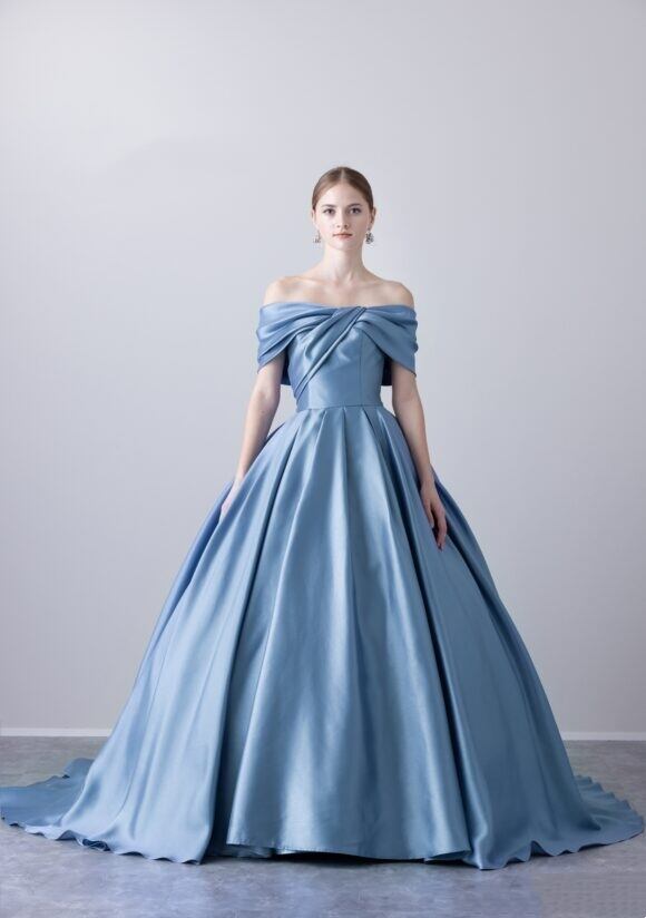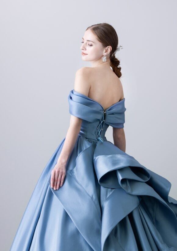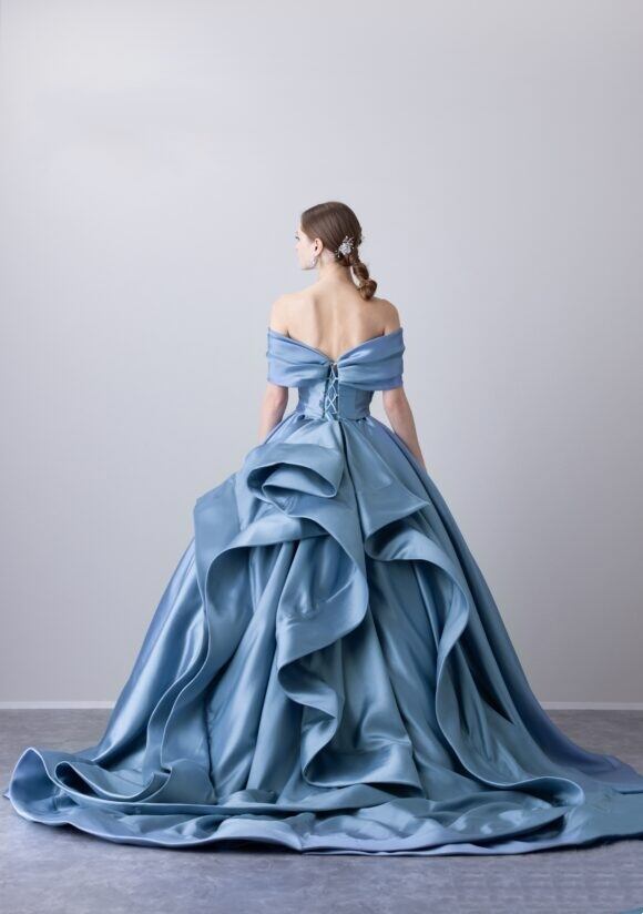 美品!スカイブルー 水色カラードレス ラッフルフリルトレーン パーティードレス ボリュームドレス オフショルダー【色変更可能】