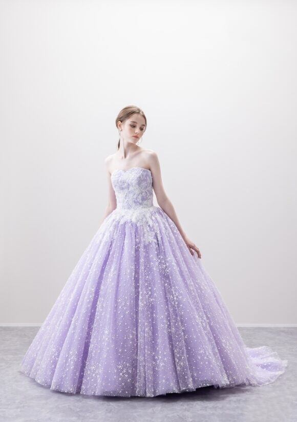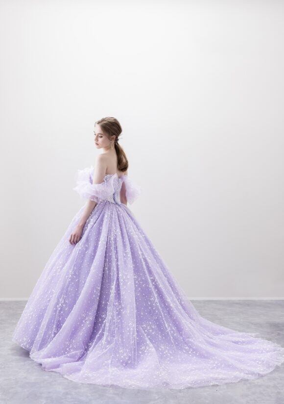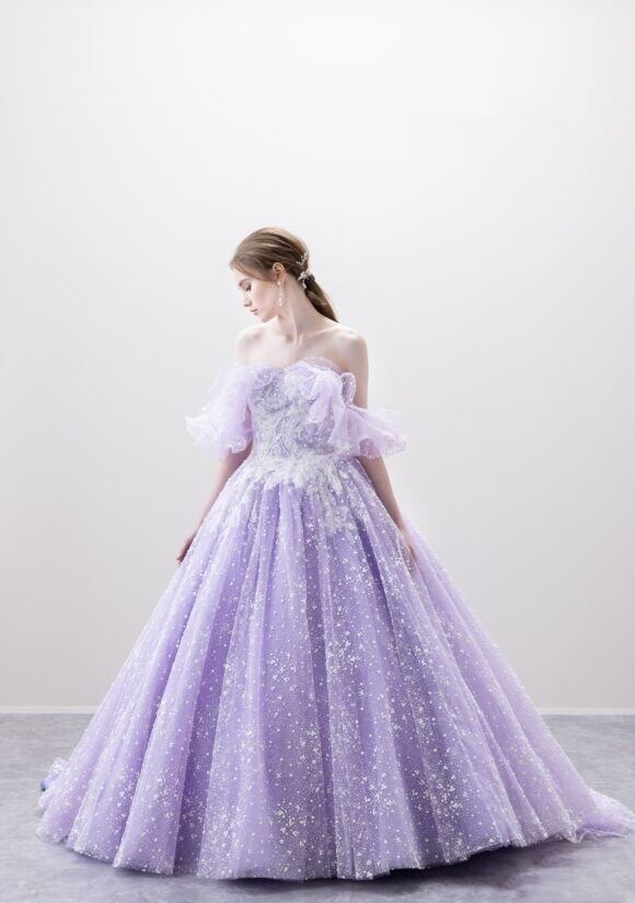 美品!ライトパープルカラードレス フリルオフショルダー キラキララメチュール パーティードレス ミディアムドレス【色変更可能】