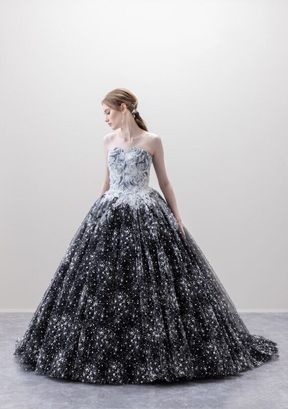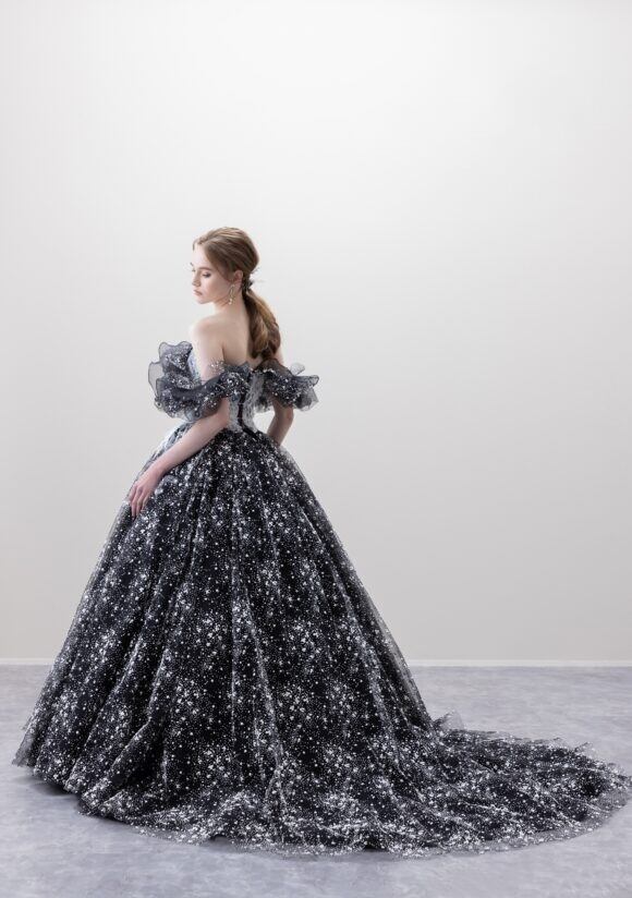美品!ブラックカラードレス 星空ドレス フリルオフショルダー キラキララメチュール パーティードレス ミディアムドレス【色変更可能】