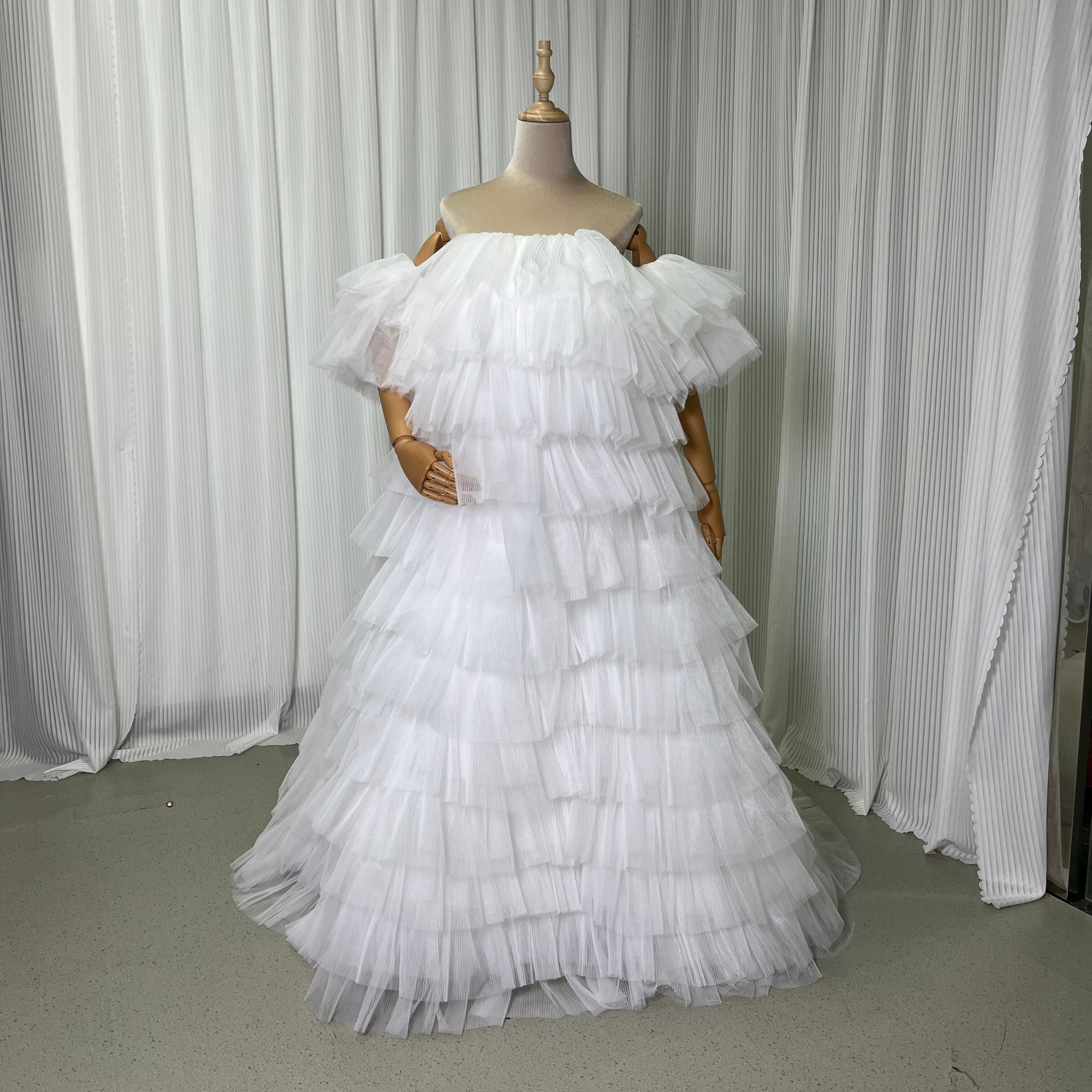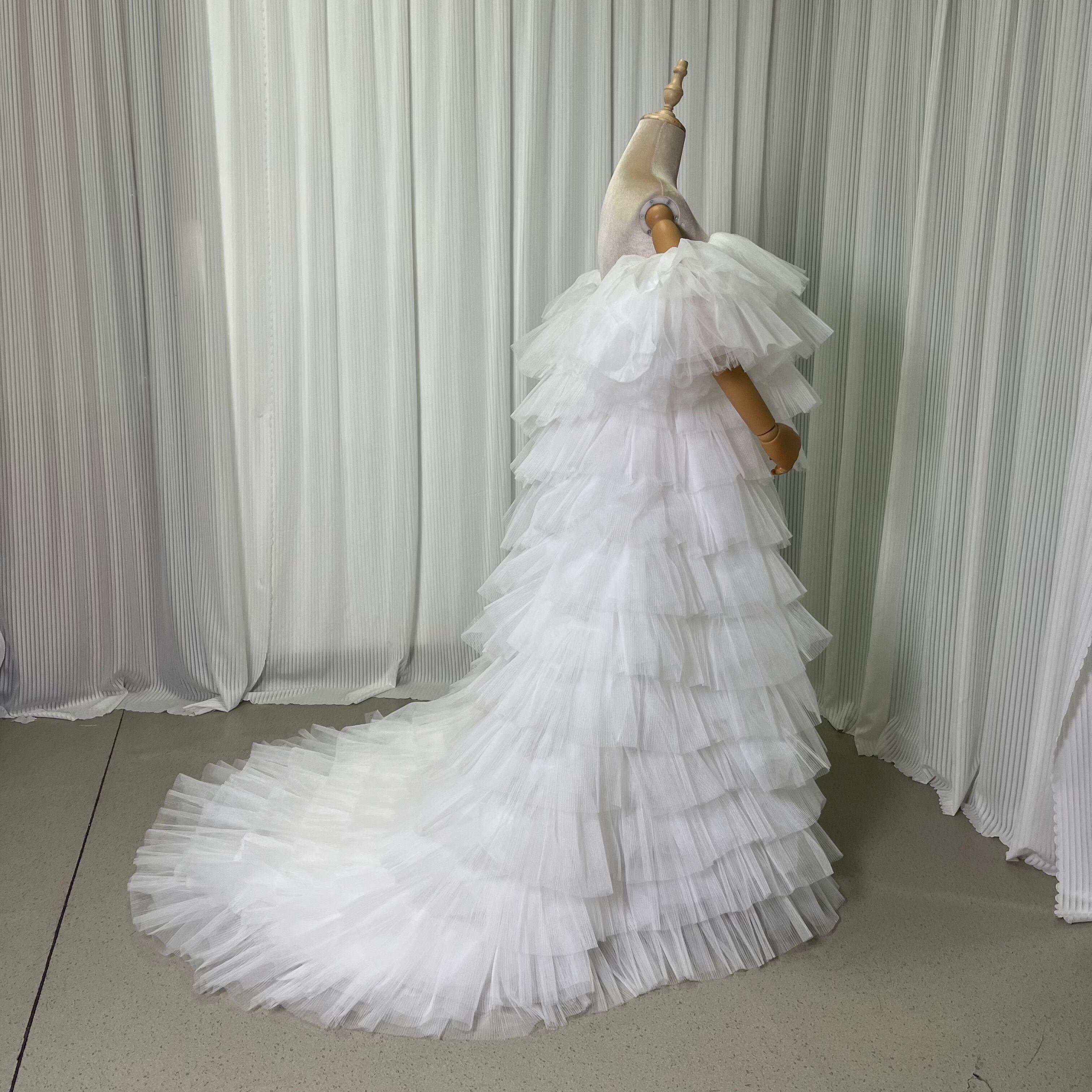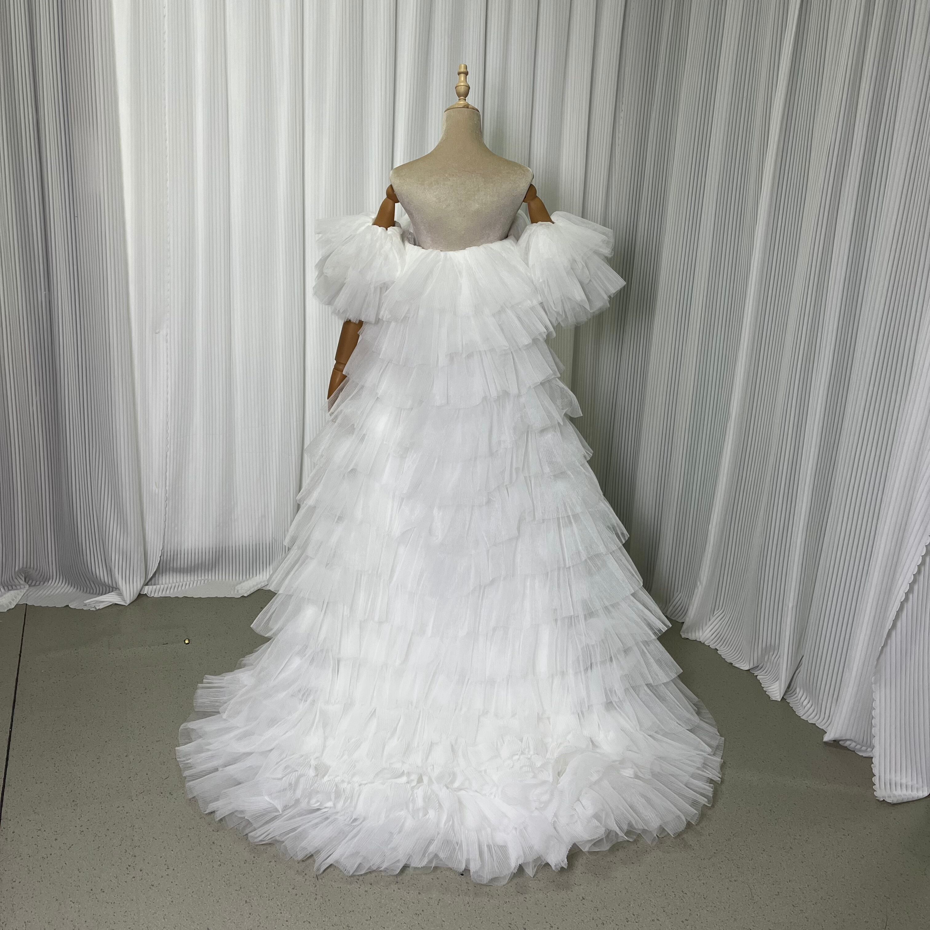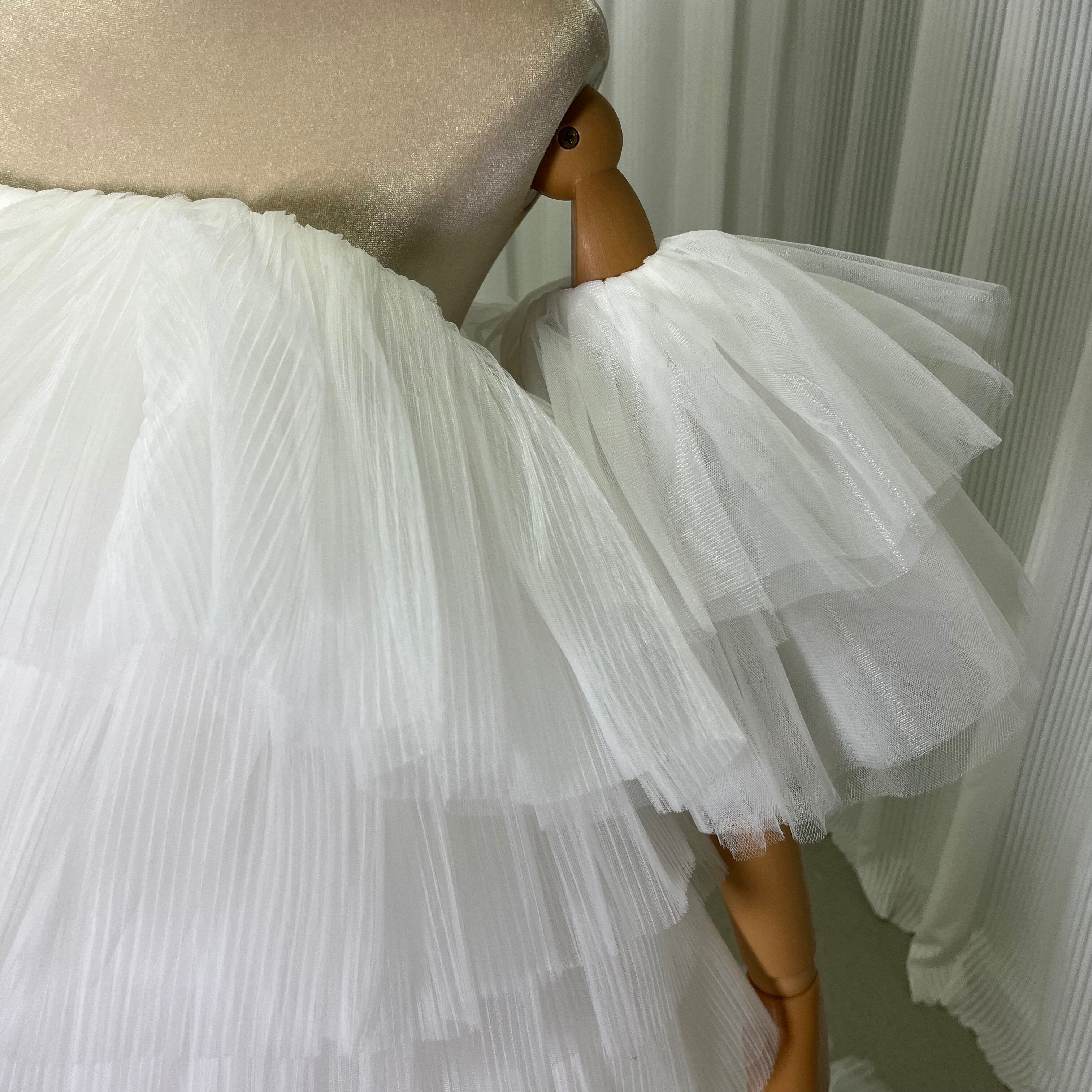 オフホワイト もこもこ カラードレス チュールドレス フリルオフショルダー リボン ふわふわ パフスリーブボリュームドレス 華やかなトレーン