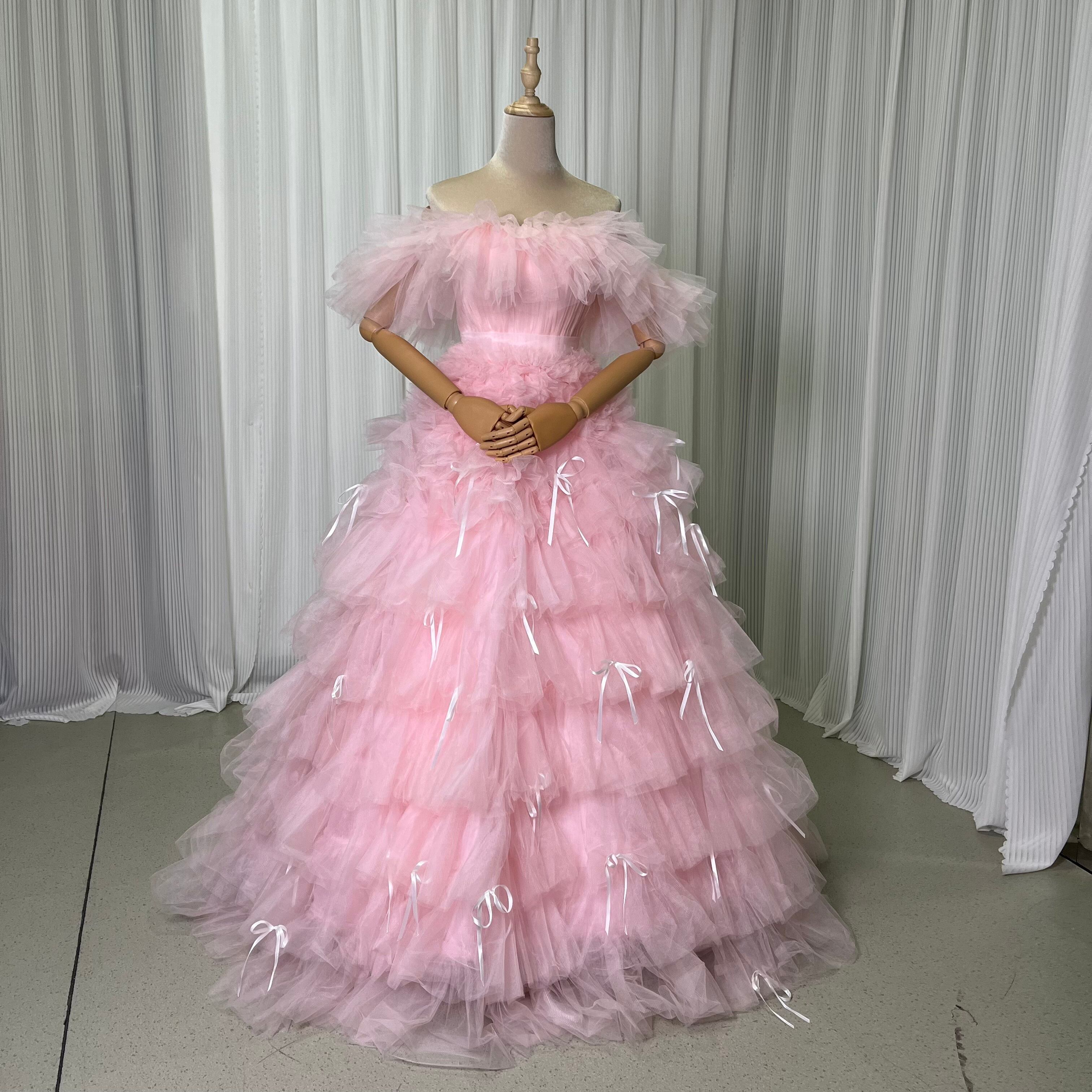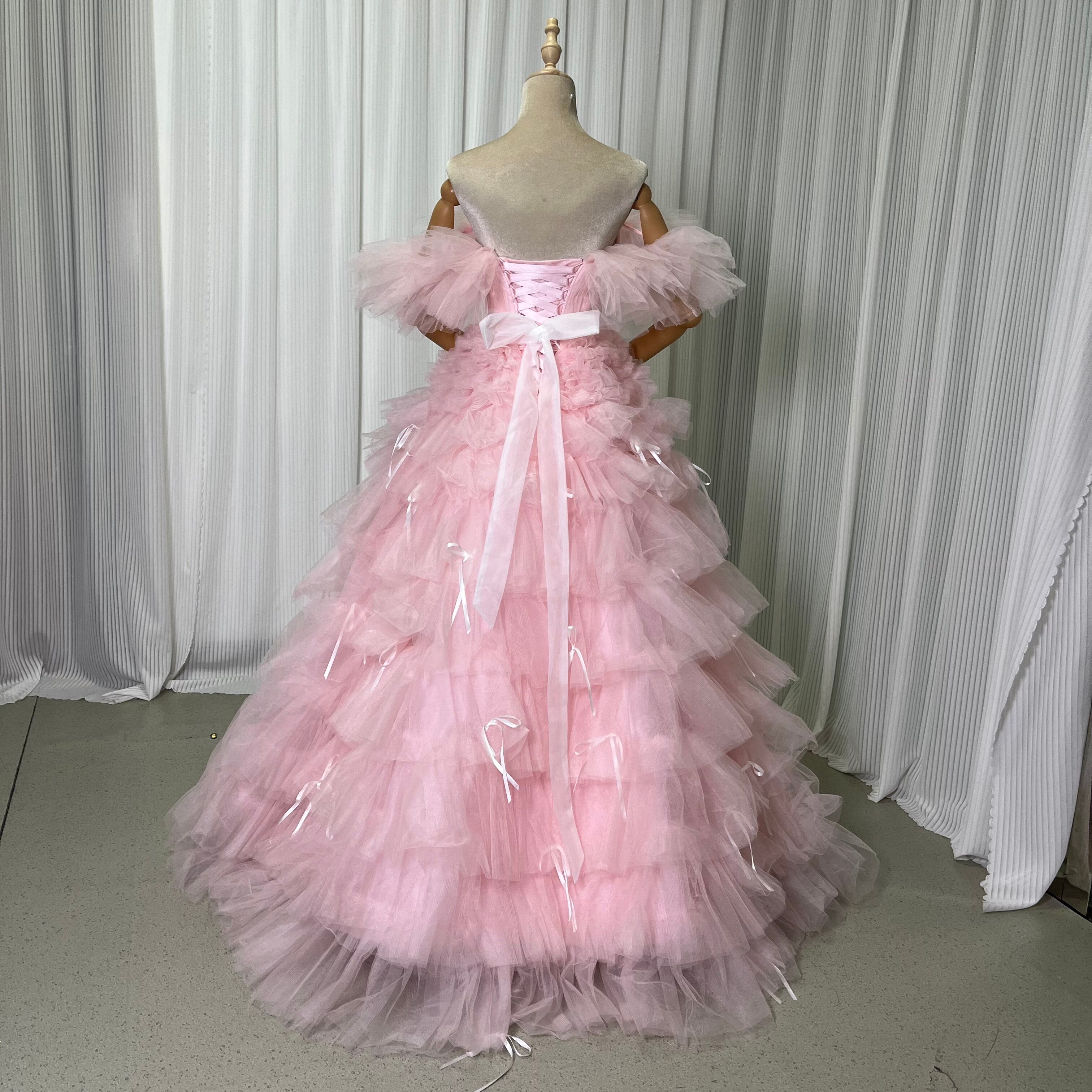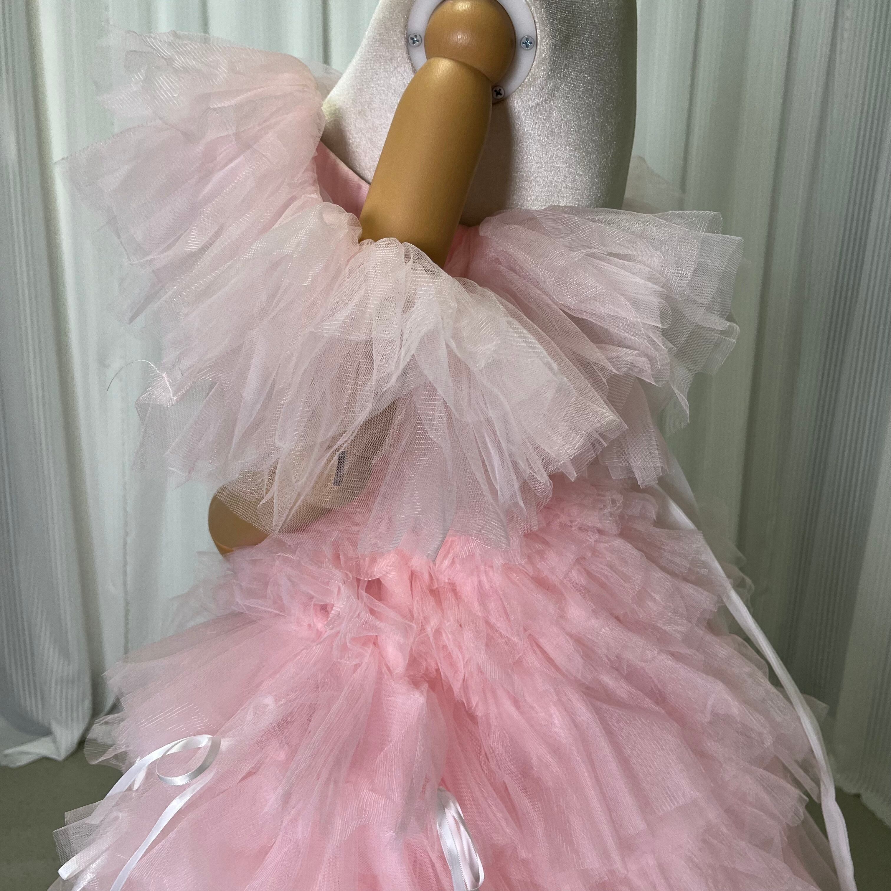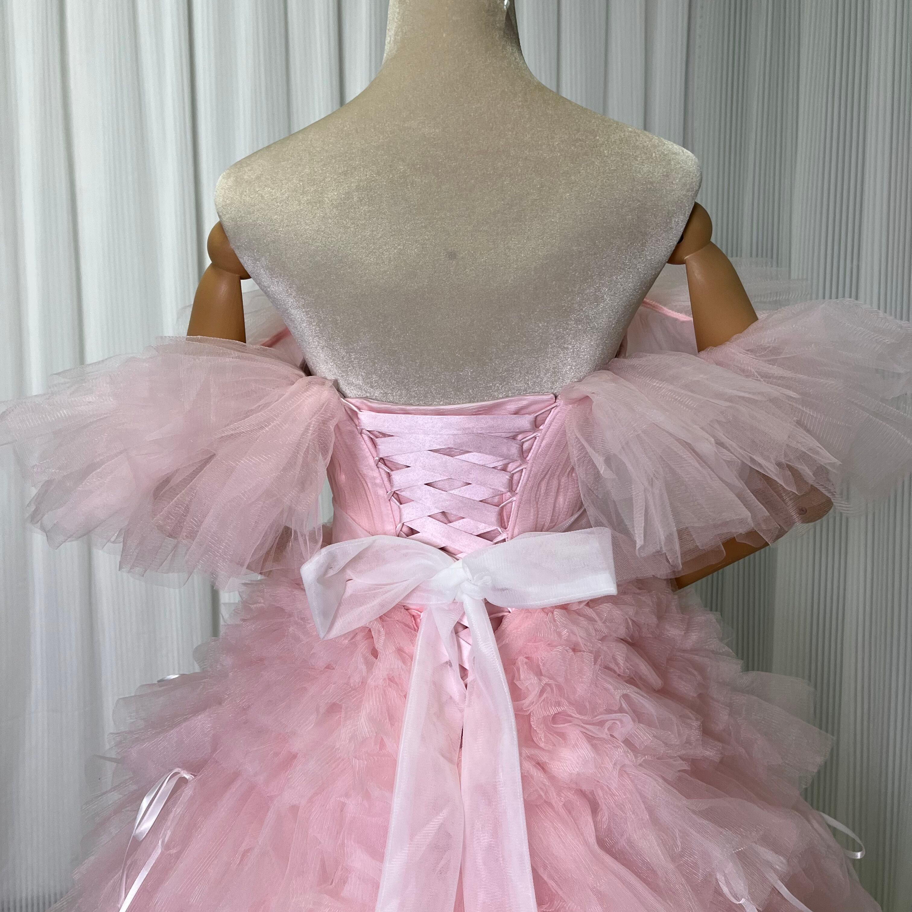 オフショルダー もこもこピンクカラードレス チュールドレス フリルオフショルダー /花嫁/結婚式/披露宴/