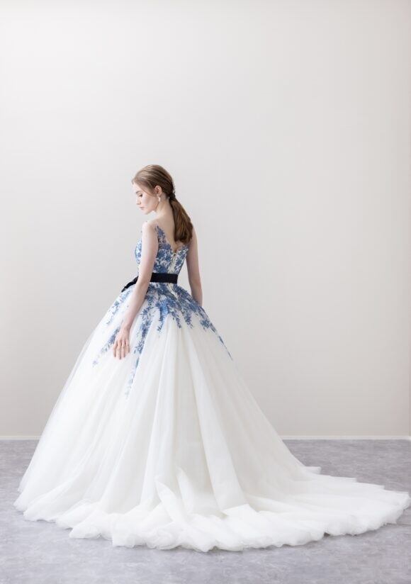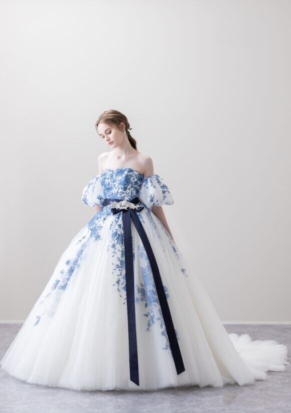 美品!カラードレス ブルーレースアップリケ 上品レースボレロ ウエディングドレス パーティードレス パフスリーブ【色変更可能】