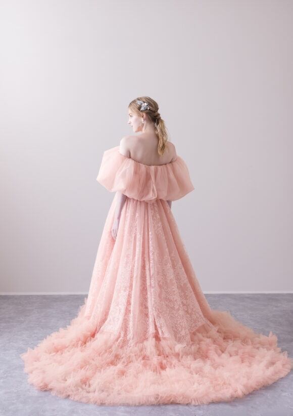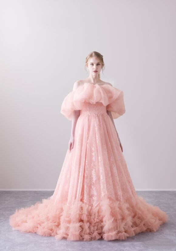 美品!総レースドレス コーラルピンクカラードレス パフオフショルダー ロールカラー もふもふ裾 パーティードレス ミディアムドレス【色変更可能】