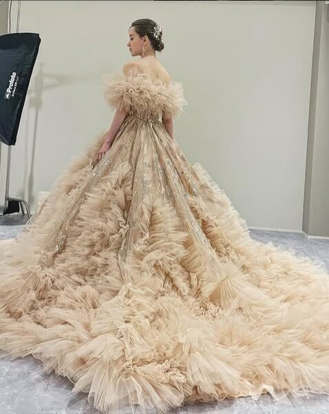 美品!フリルドレス ミルクティーベージュカラードレス ふわふわオフショルダー パーティードレス ボリュームドレス プリンセスライン【色変更可能】